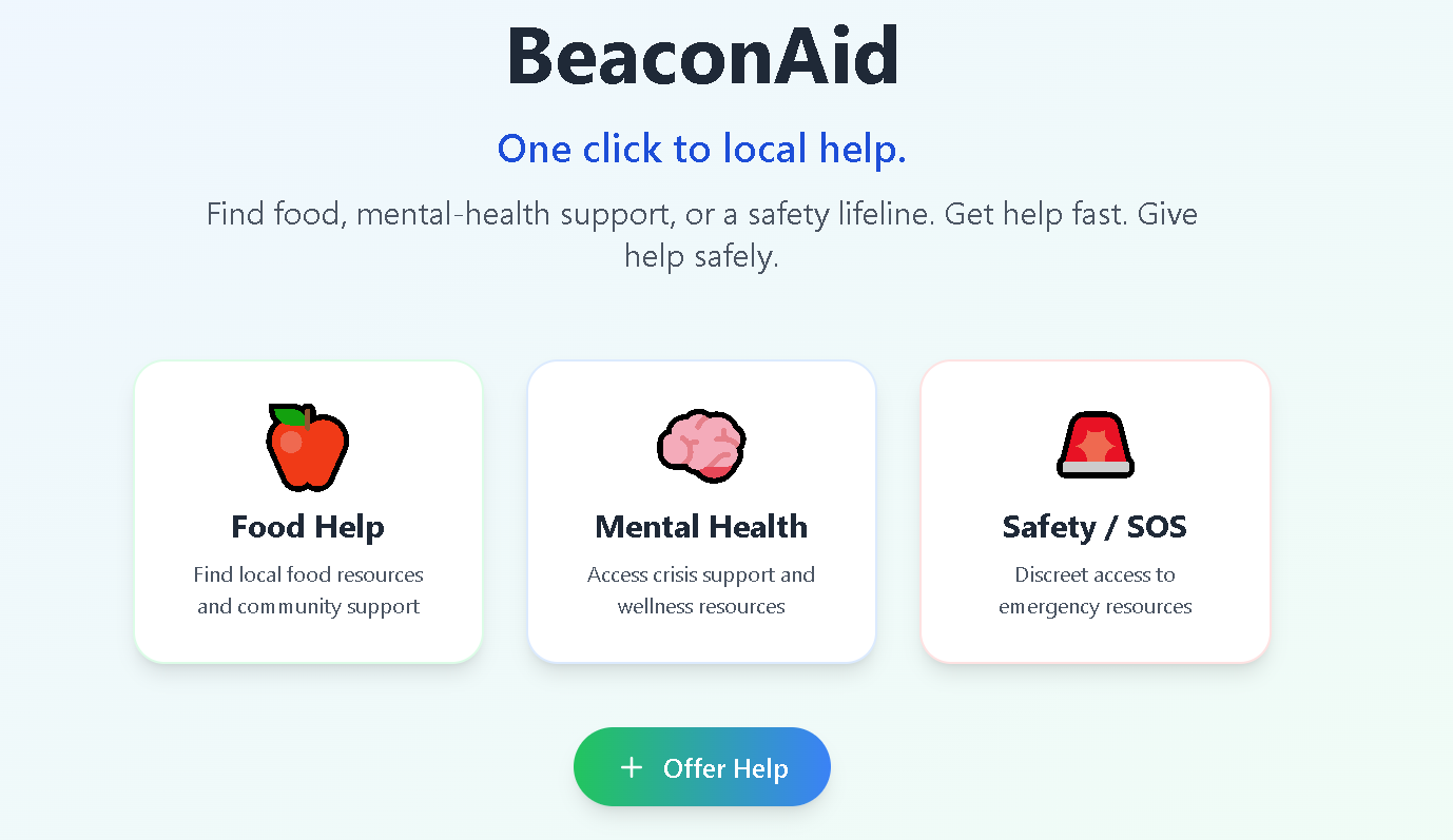 We wanted to create a simple, one-click platform that connects people in urgent need with local help. From food shortages to mental health support and personal safety, real-world crises often lack a fast, accessible digital solution. BeaconAid aims to bridge that gap and make help just a click away.