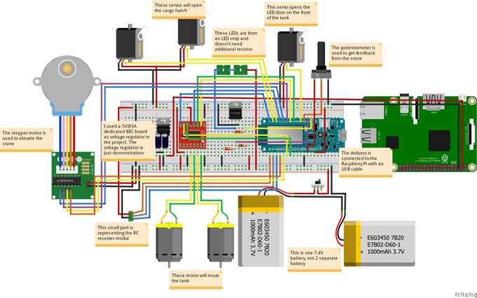 This project is not using the WiFi functionality of the Arduino MKR1000 at the moment, but as I know, you can't just replace it with an Arduino Uno if you want to control the tank using an RC transmitter. My project is using 3 channels for controlling speed, turning and the crane. I need 3 pins with external interrupt capability. Arduino Uno's have only 2 pins for this purpose. We need those pins to read the PWM values of the RC receiver's corresponding channels.