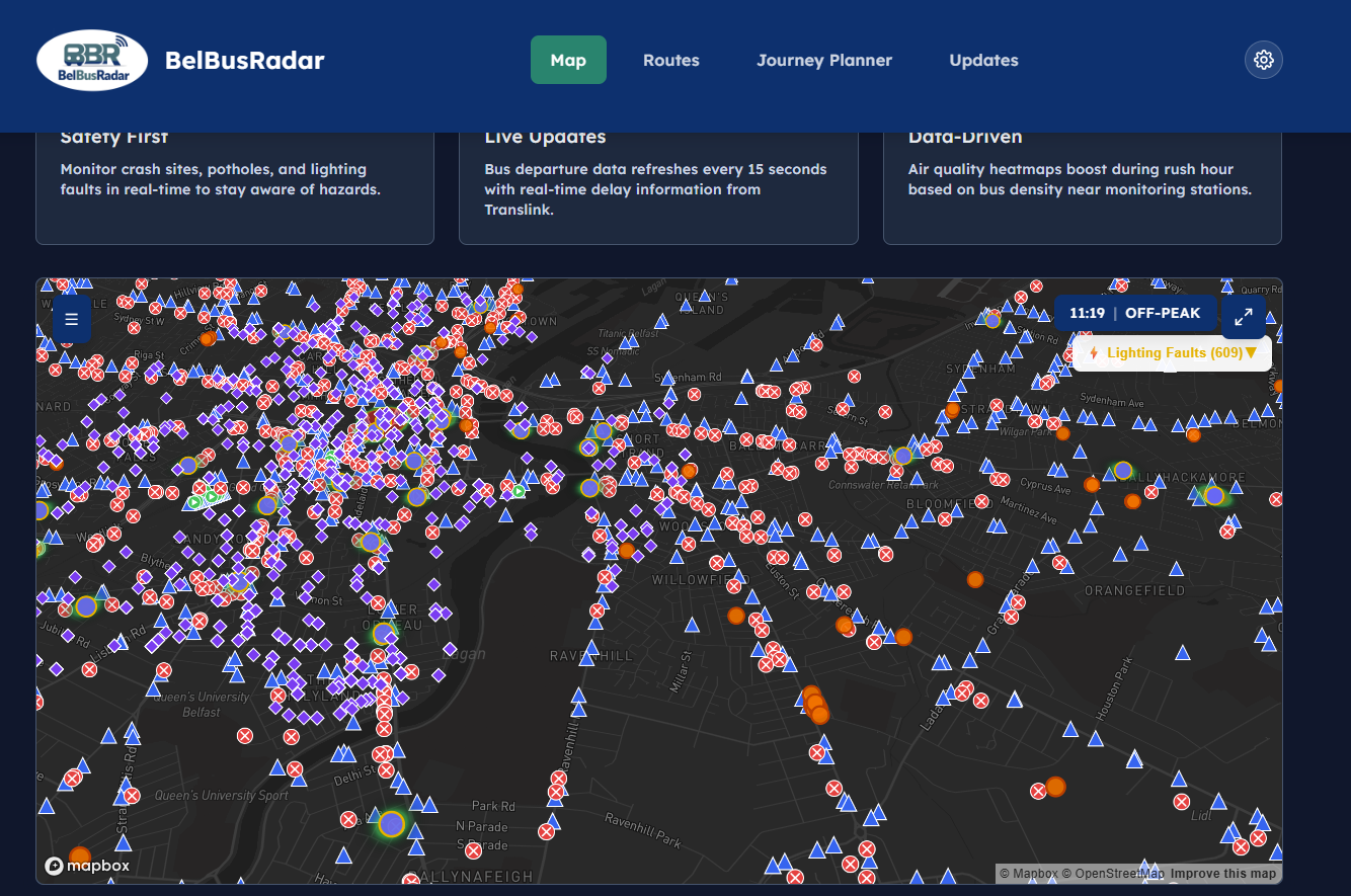 BelBusRadar is a real-time interactive map dashboard that combines live bus tracking, journey planning, route exploration, service updates, and AI-powered safety intelligence into one unified platform. It overlays 6 live data sources onto an interactive Mapbox map — bus stops, live moving buses, traffic crashes, potholes, street crime, and air quality. The "Make My Journey Safer" feature analyses real PSNI crime data within 100m of your route using weighted severity scoring to generate contextual safety tips.