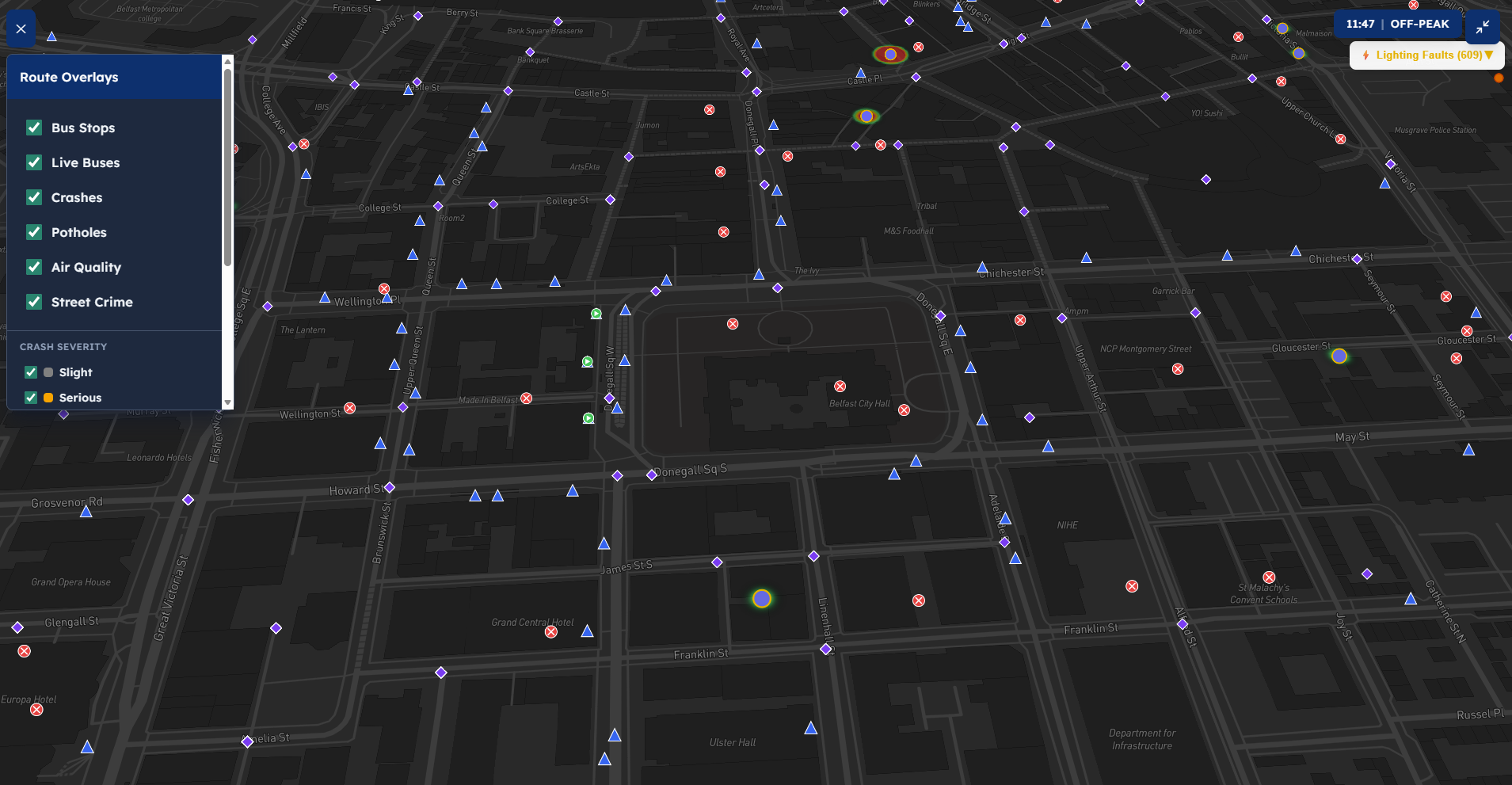As Belfast commuters ourselves, we were frustrated by needing 3+ separate apps just to plan a bus journey, check if it's on time, and buy a ticket. None of them show you safety information — crime hotspots, crash history, broken streetlights — things that actually matter when you're walking to a bus stop at night. We wanted to build the app we wished existed.