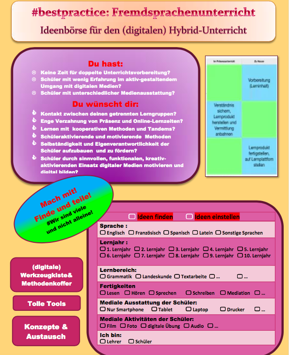 Uns ist dabei wichtig, dass diese Austauschbörse Open-Ressource und kostenlos ist, so dass sie auch eine breite Nutzerschaft erreicht. Durch diesen Austausch kann nicht nur der aktuelle Unterricht in der Corona-Situation verbessert werden, sondern auch langfristig ein Beitrag geleistet werden, Fremdsprachenunterricht digital neu zu denken bzw. zu ergänzen und digitale Elemente auch in Zukunft vermehrt fachdidaktisch sinnvoll in den Unterricht zu integrieren. Zentral ist dabei der Gedanke des Austausches von best-practice-Erfahrungen: Gute, einfache, für Schüler (benachteiligter Haushalte) auch mit einfachen technischen Mitteln (z.B. nur mit dem Smartphone) umsetzbare, aber nachhaltige Unterrichtsideen und Lernsettings.
