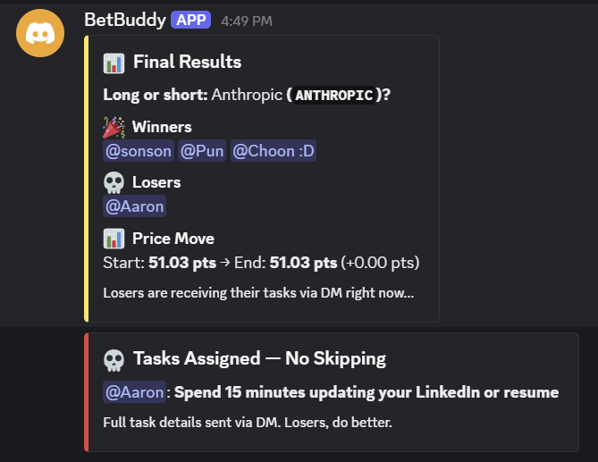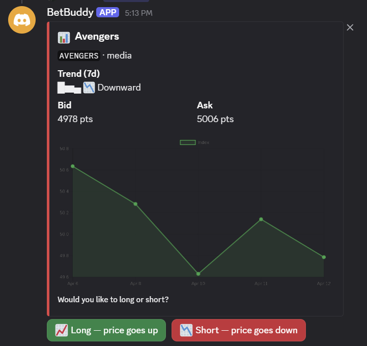 BetBuddies will read through the chat to find the common interest of this group chat (personalize). Then, BetBuddies pull the virality data tailor to the group interest from The Forum to create the question for everyone to betting on, either long or short. If you got it wrong, BetBuddies will give you the punishment to do a good things!