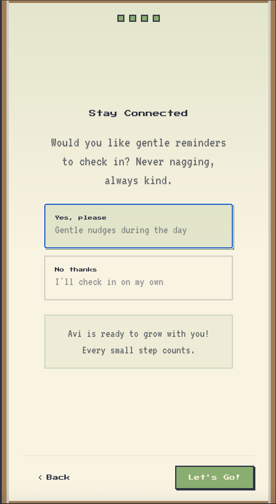 We were inspired by comfort dogs, who have been shown to drastically improve the mental situations and quality of life of those in need. We wanted to emulate that feeling without applying all the pressure or complexity involved with owning a dog. Additionally, similiar to dogs, we wanted to create an app where the user felt connected with their environment.