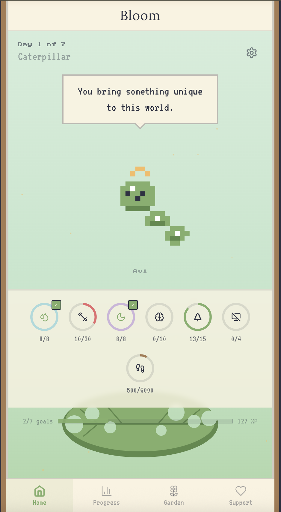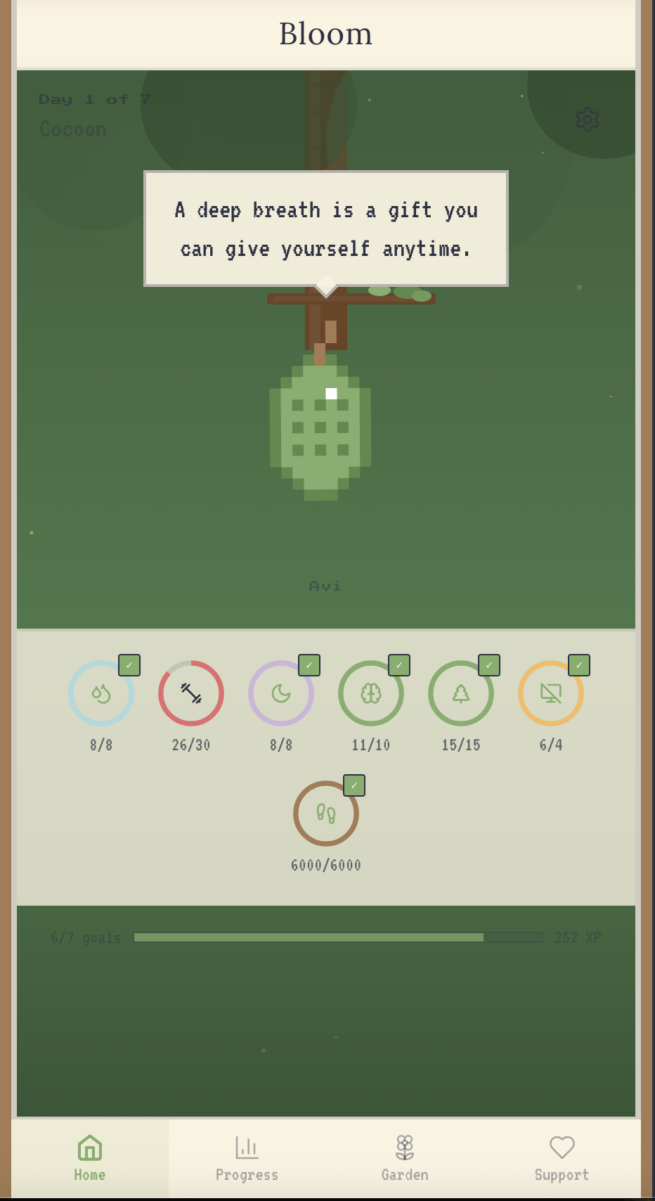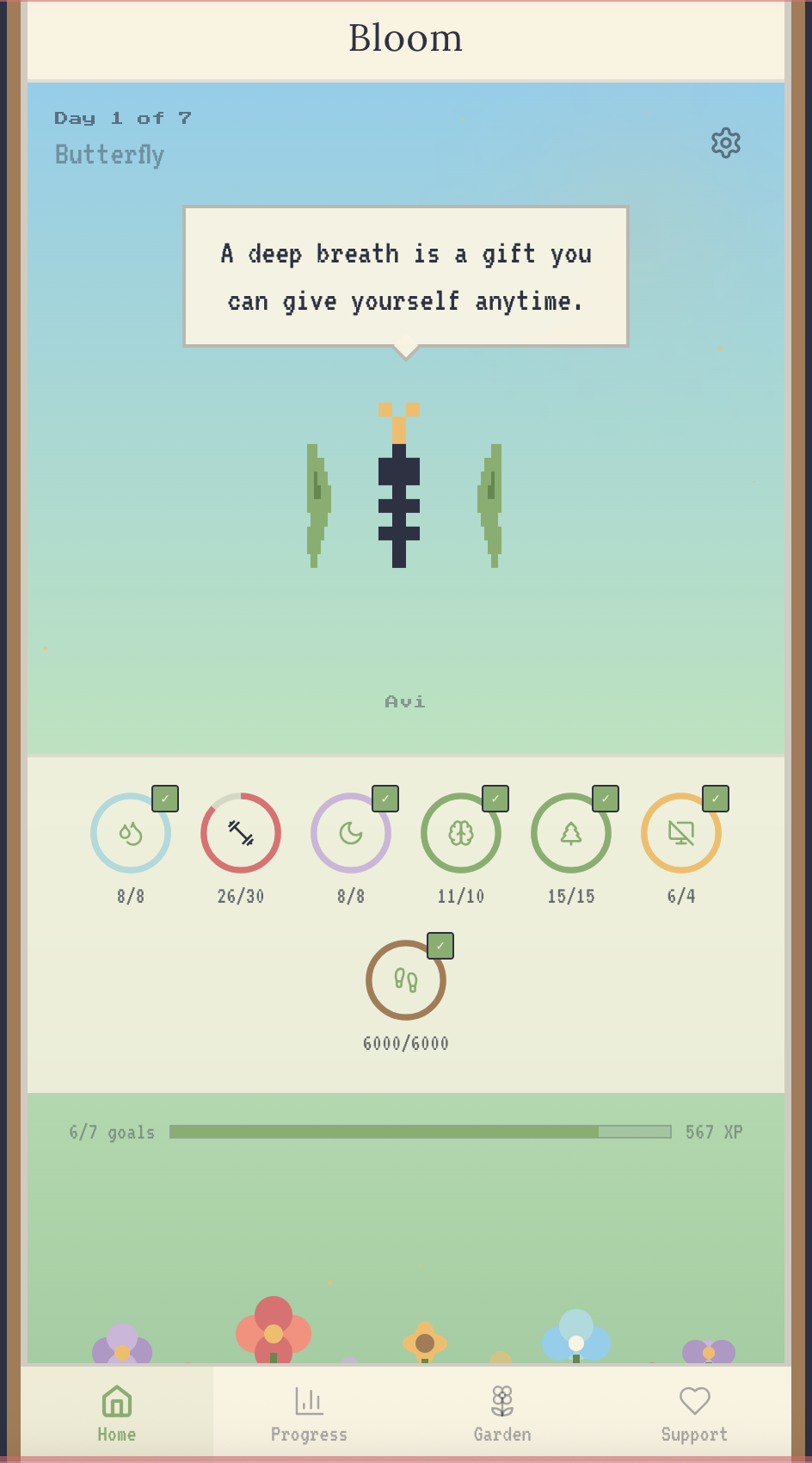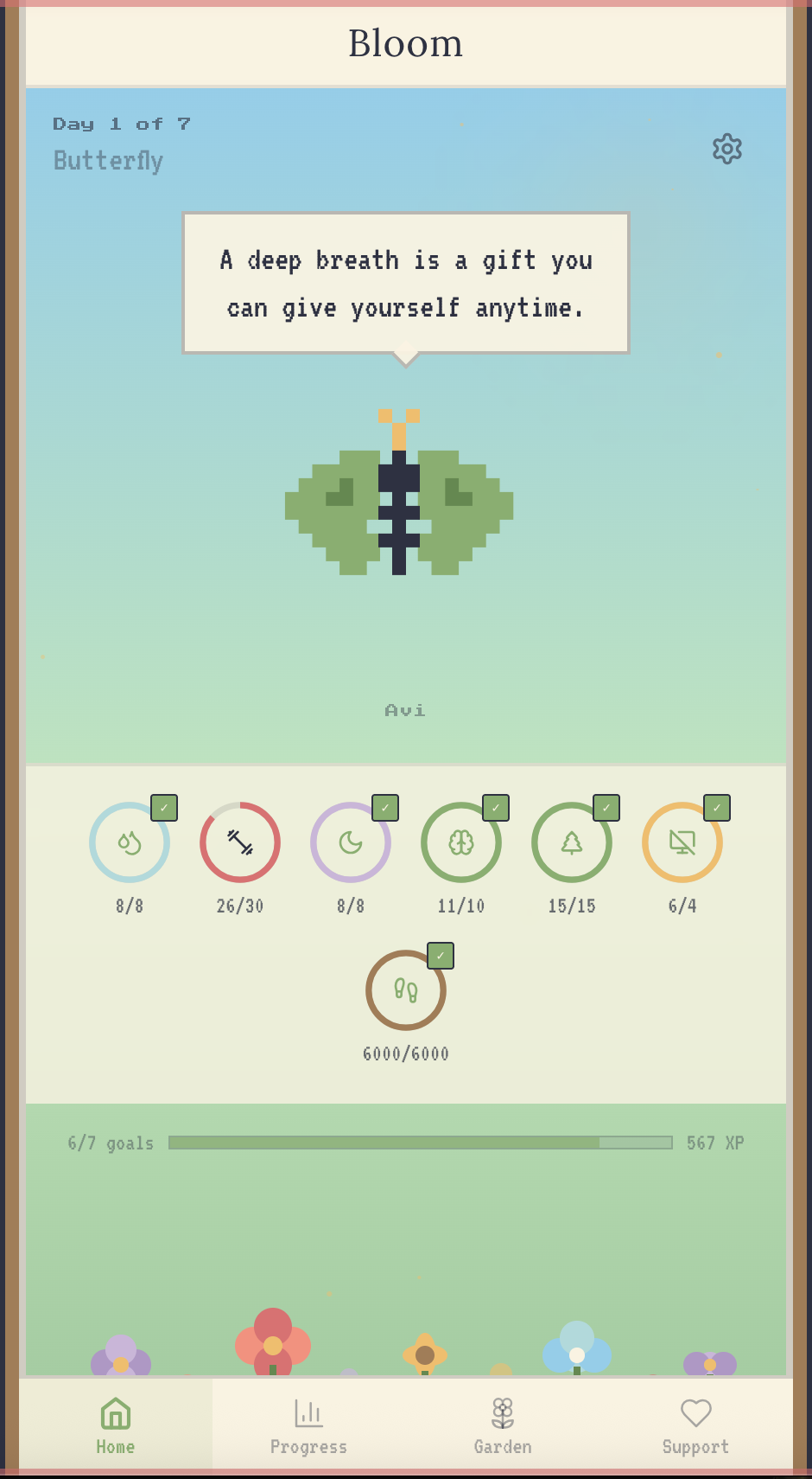 Betterfly uses a pet companion (caterpillar) in order to encourage routines through daily tasks. The user can evolve and collect butterflies, and the app provides positive affirmations, mental health resources, and a mindfulness survey. The initial investment of involving the pet strengthens the connection and keeps the user completing tasks, providing motivation and satisfaction in doing things good for them.