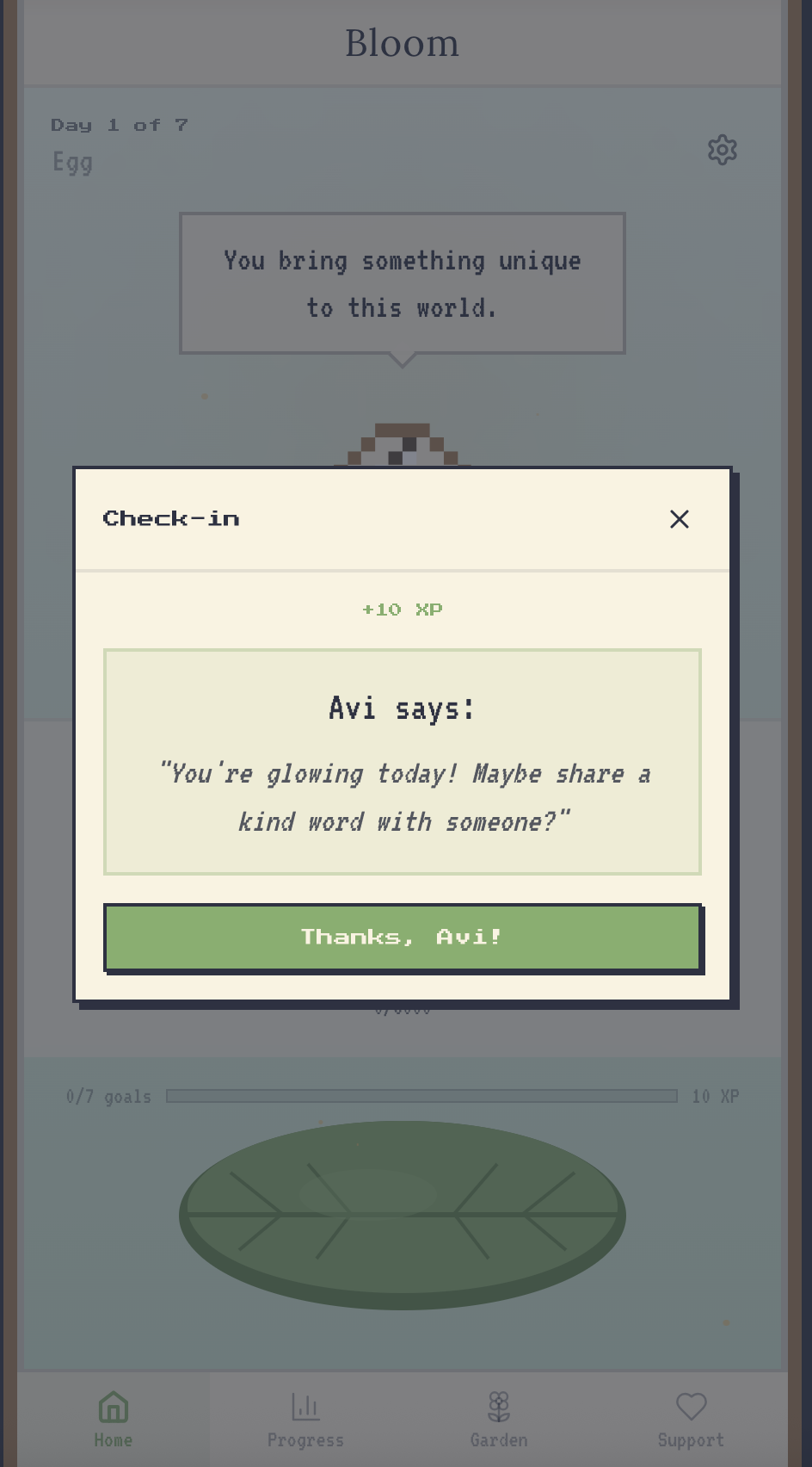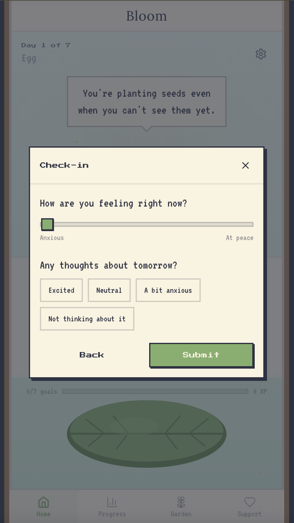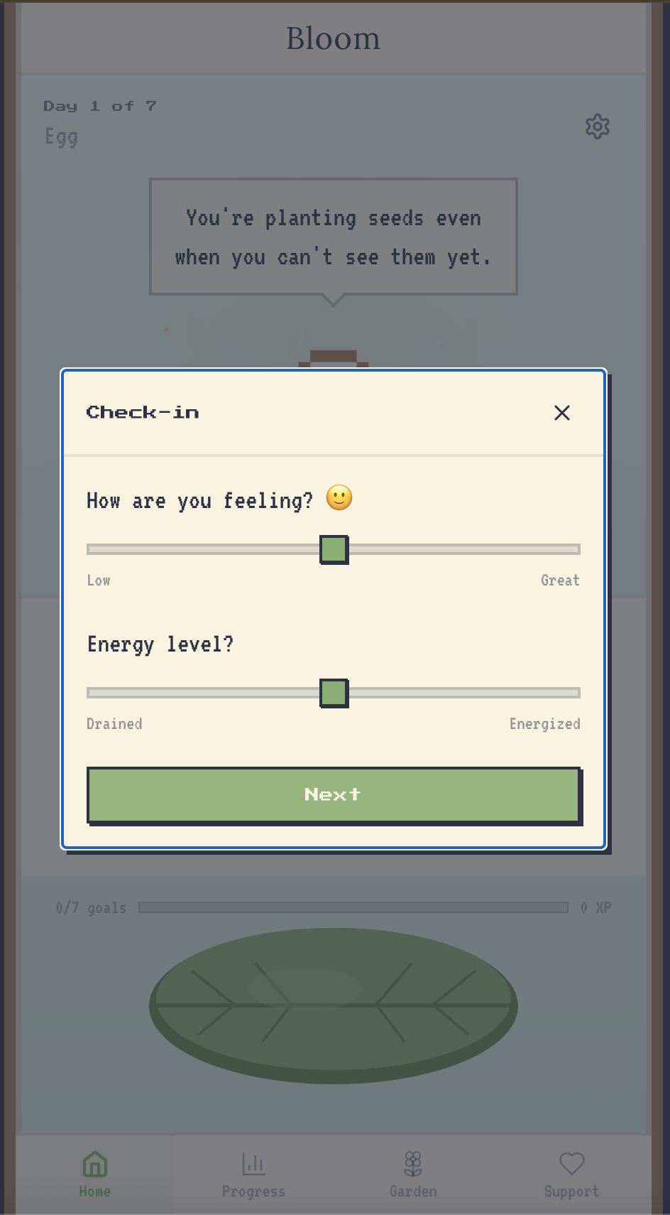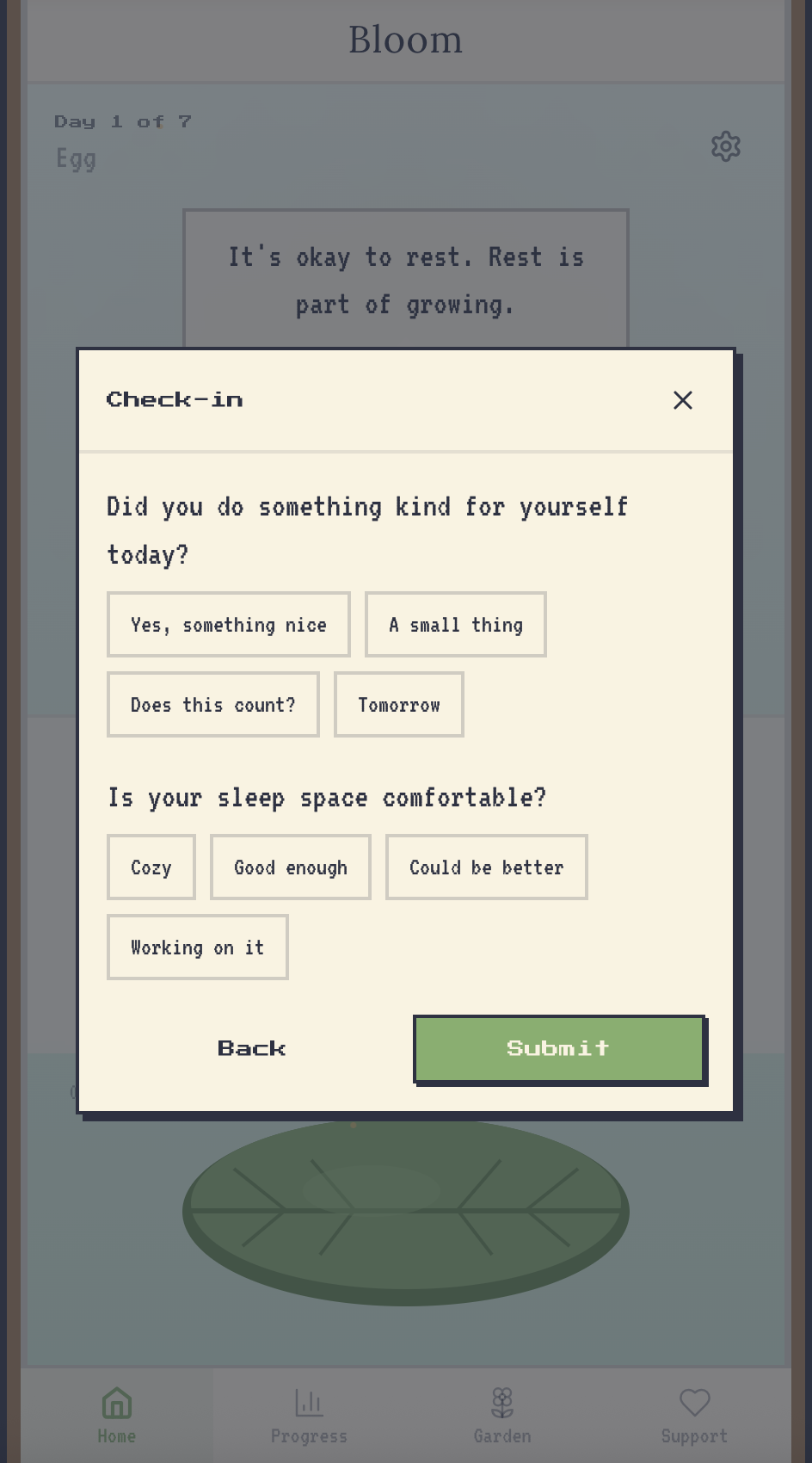 Betterfly uses a pet companion (caterpillar) in order to encourage routines through daily tasks. The user can evolve and collect butterflies, and the app provides positive affirmations, mental health resources, and a mindfulness survey. The initial investment of involving the pet strengthens the connection and keeps the user completing tasks, providing motivation and satisfaction in doing things good for them.