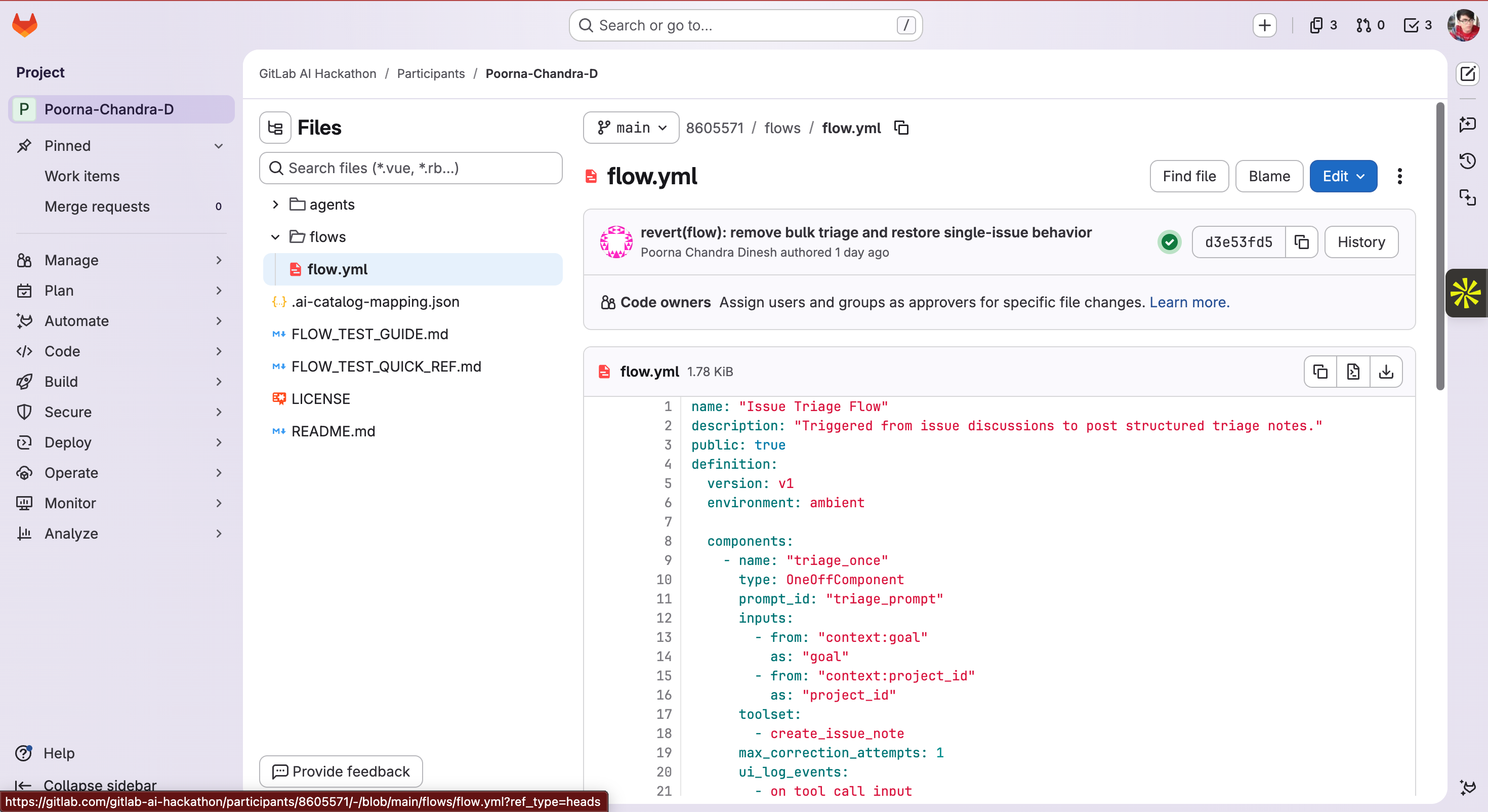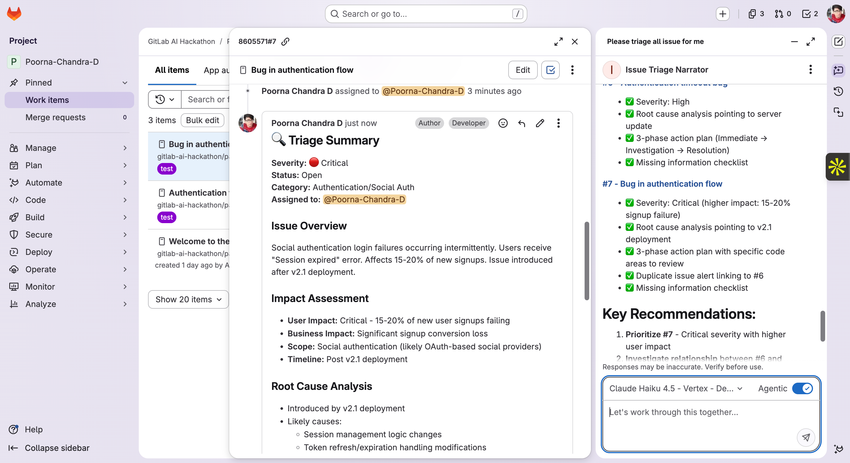 Issue Triage Narrator is a GitLab Duo agent + flow that triggers from an issue mention and posts a structured triage note. For each triggered issue, it creates a comment with: