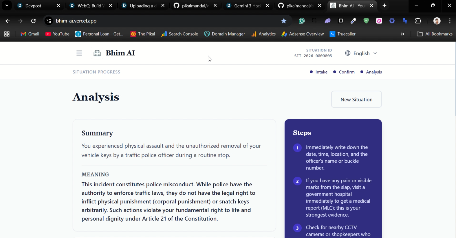 Bhim AI first takes the user's input where the user tells the situation he/she faced and what his/her constituational rights in this matter and start performing deep reasoning and analysis of the situation then it shows the user the full context so far with some assumed by Bhim AI and some crtical info needs to be confirmed by the user such as local laws, etc before proceeding with the analysis again then after perfomring reasoning again it provides the user assessment summary, it's meaning, how bhim reached this conclusion, citizen rights, boundaries, next steps to perform immediately and if required draft letter that the user can copy and send it to the concerned legal authorities.