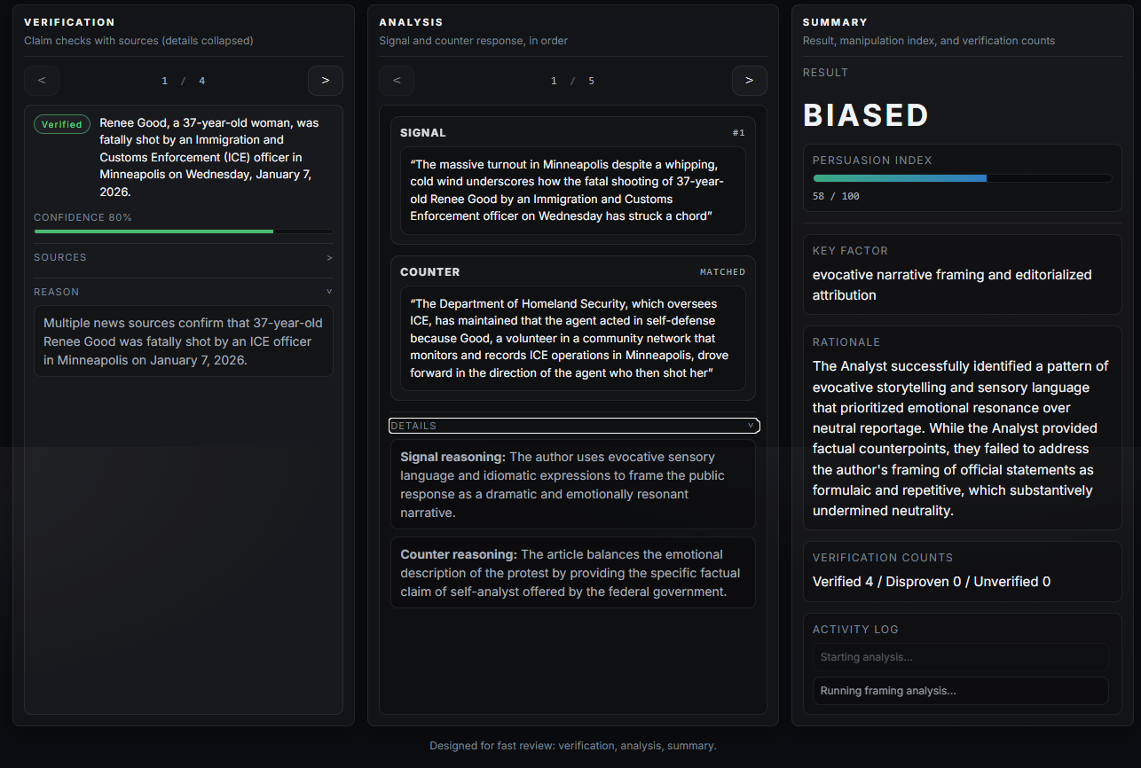 - One agent analyzes framing and emotionally loaded language