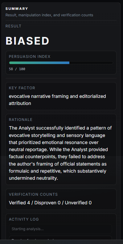 First, it looks at the language and framing of the article. It finds emotionally loaded words, selective wording, and patterns that can shape how the reader feels about an event.