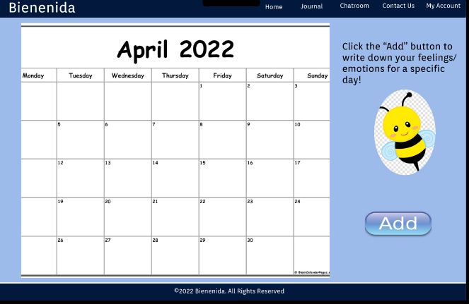 Biene allows people to take care of their mental health, by providing numerous features. This website consists of a homepage, journal, chatroom, contact us, and account. Users can sign in/sign up into their account and journal their thoughts/feelings on a daily basis. The journal comes with a built in calendar, where the user can view what they have written. They can also head over to the public chatroom, where they can anonymously talk to other users as well as receive help. Moreover, if the user wants to get in touch with therapists/counselors or need to reach the helpline, they can do so via the Contact Us page. The user has access to everything, with a click of a button.