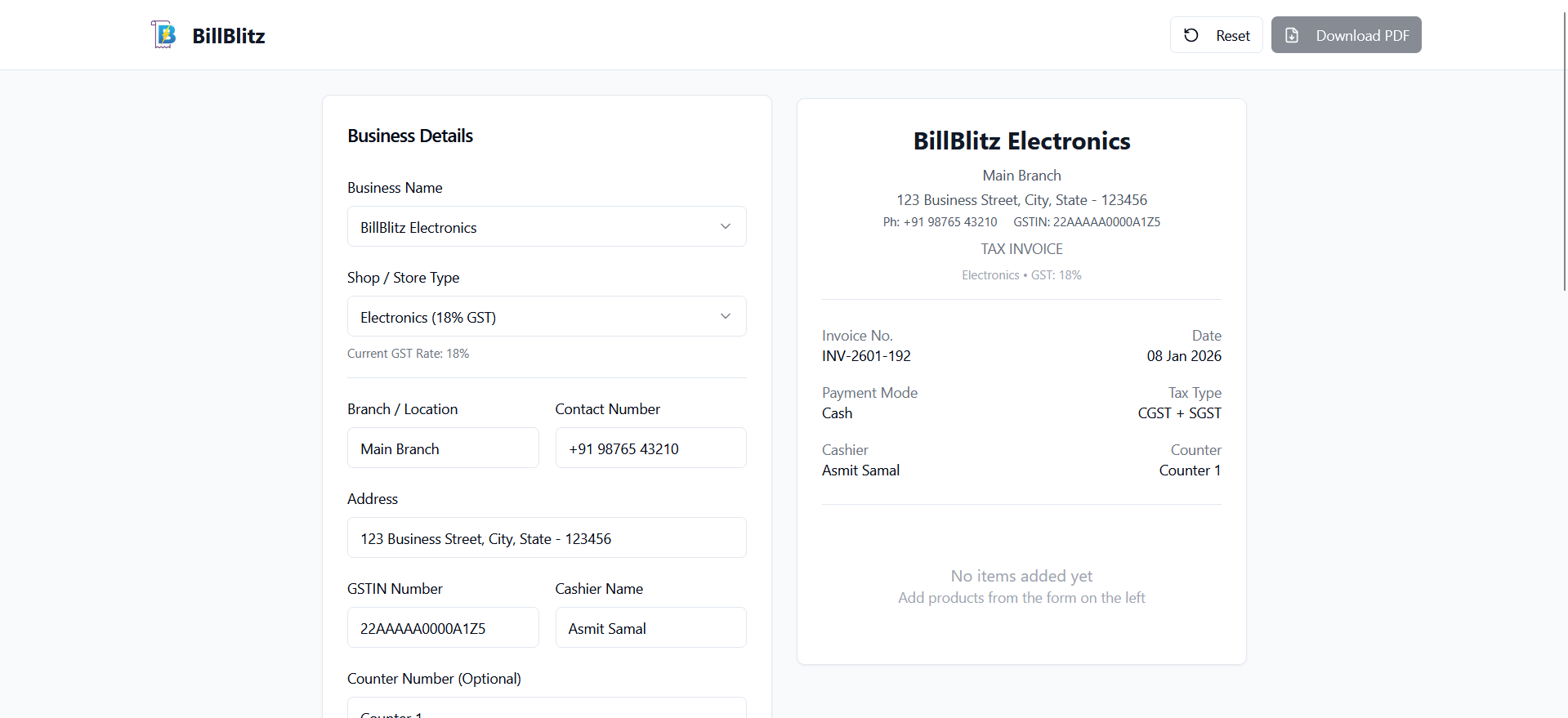 BillBlitz is a professional GST invoice generator that allows users to: 1. Enter product name, quantity, and price manually 2. Automatically calculate subtotal, GST, and grand total 3. Support different business types with predefined GST rates 4. Generate clean, GST-compliant invoices 5. Download a professionally formatted PDF instantly All calculations are handled automatically, reducing errors and saving time.