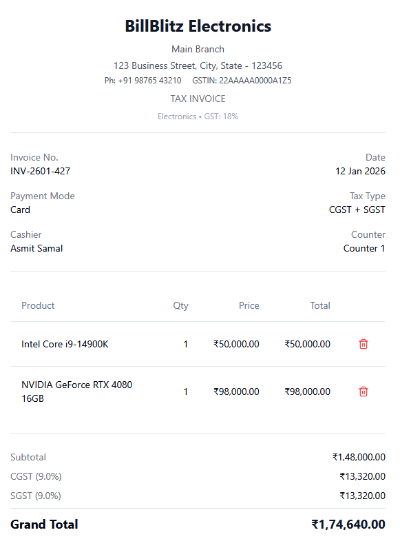 We built BillBlitz as a frontend-only web application: 1. React for component-based UI and state management 2. TypeScript for clean, safe, and maintainable code 3. Tailwind CSS + shadcn/ui for a modern, responsive interface 4. jsPDF + jsPDF-AutoTable to generate professional invoice PDFs Real-time calculations using simple formulas like: Subtotal=∑(Quantity×Price) Subtotal=∑(Quantity×Price) GST Amount=Subtotal×GST Rate GST Amount=Subtotal×GST Rate Grand Total=Subtotal+GST Amount Everything runs on the client side, making the app fast and easy to deploy.