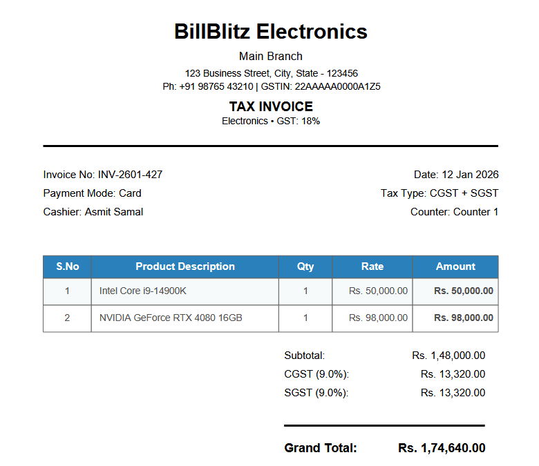Small businesses like local shops, pharmacies, and electronics stores still rely on manual billing or basic Excel sheets. This leads to calculation errors, wasted time, and unprofessional invoices. We were inspired by observing how even a simple GST calculation can slow down daily operations. Our goal was to build something simple, fast, and practical that any shopkeeper can use without technical knowledge.