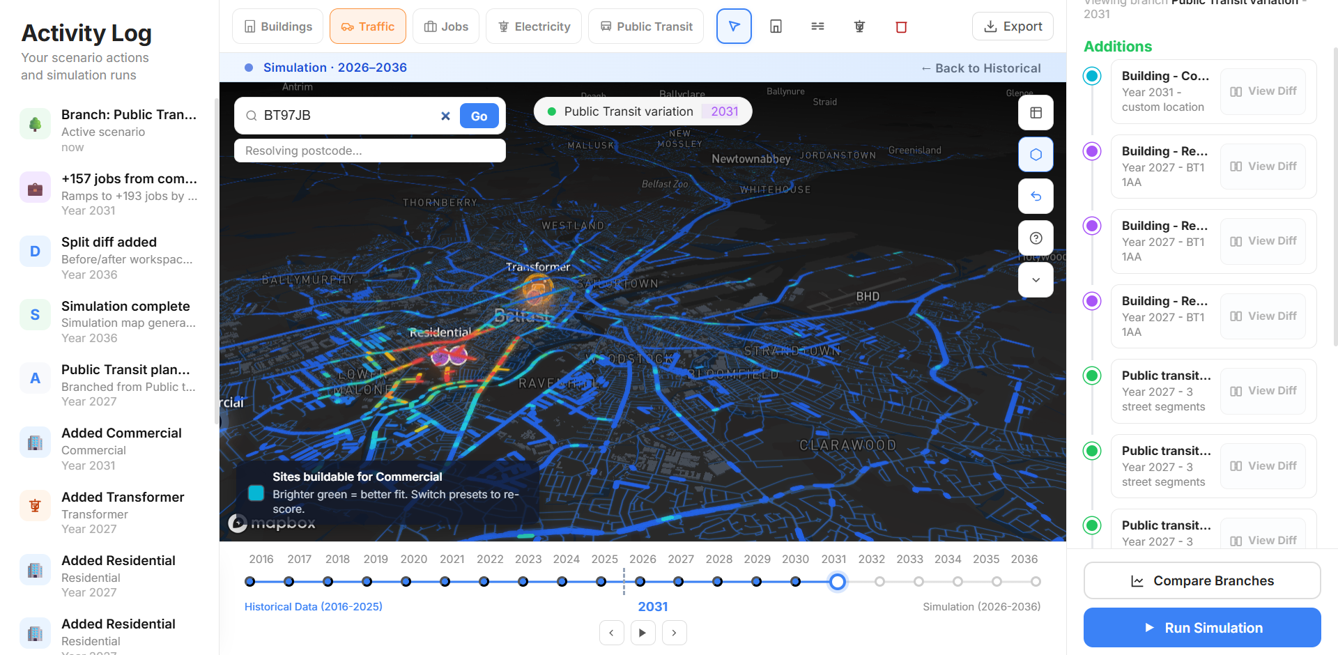 In Belfast, you can place down simulated buildings, roads, public transport, using past data from 2016 to 2026 (planning statistics, census, public transport, bike stations, air quality, electricity grid features, total population by year, layers for underground stations, economy status). We use the past 10 years of data to predict the next 10 years for the type of building you place down, seeing whether it is a great addition for the future or a waste of infrastructure