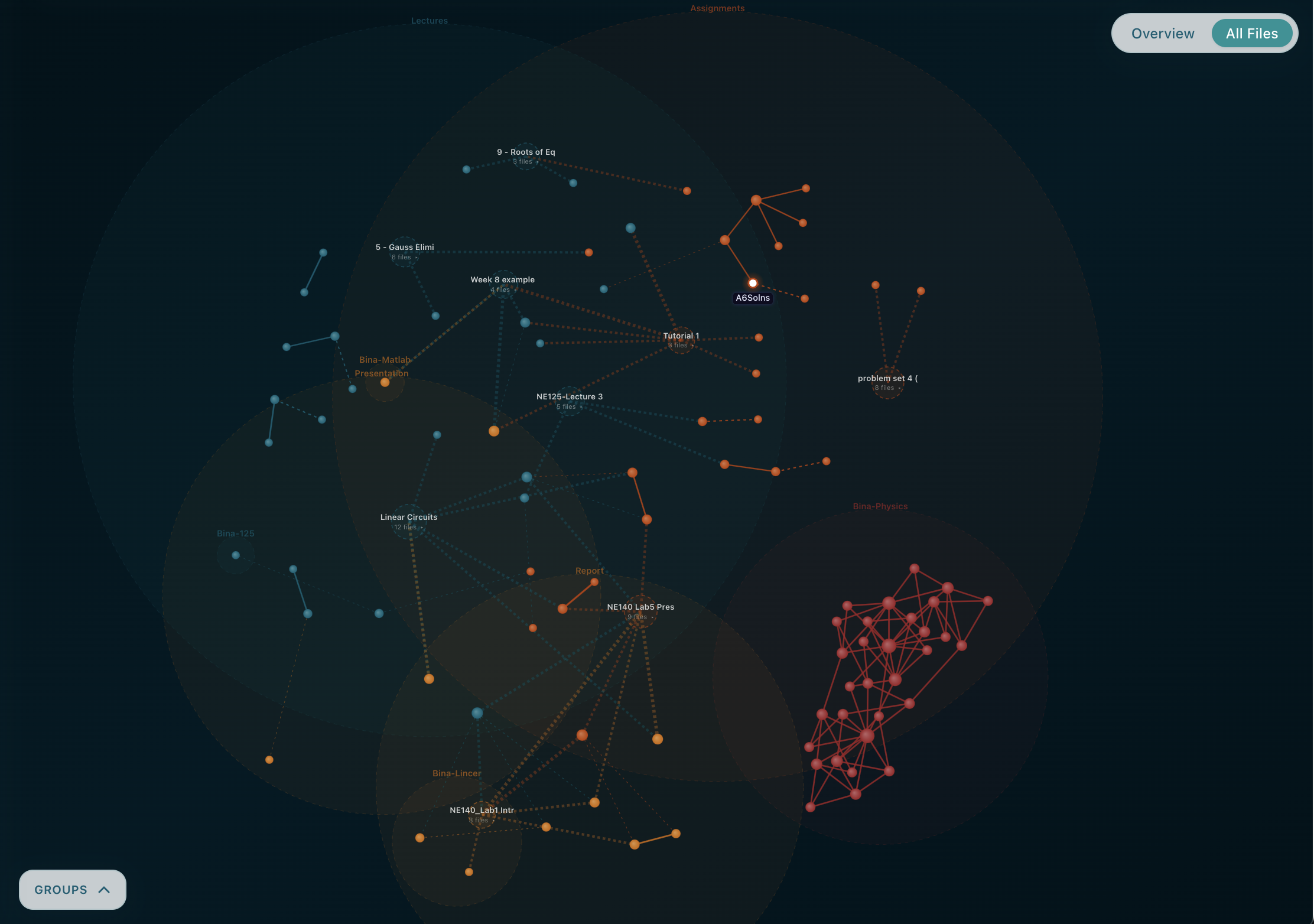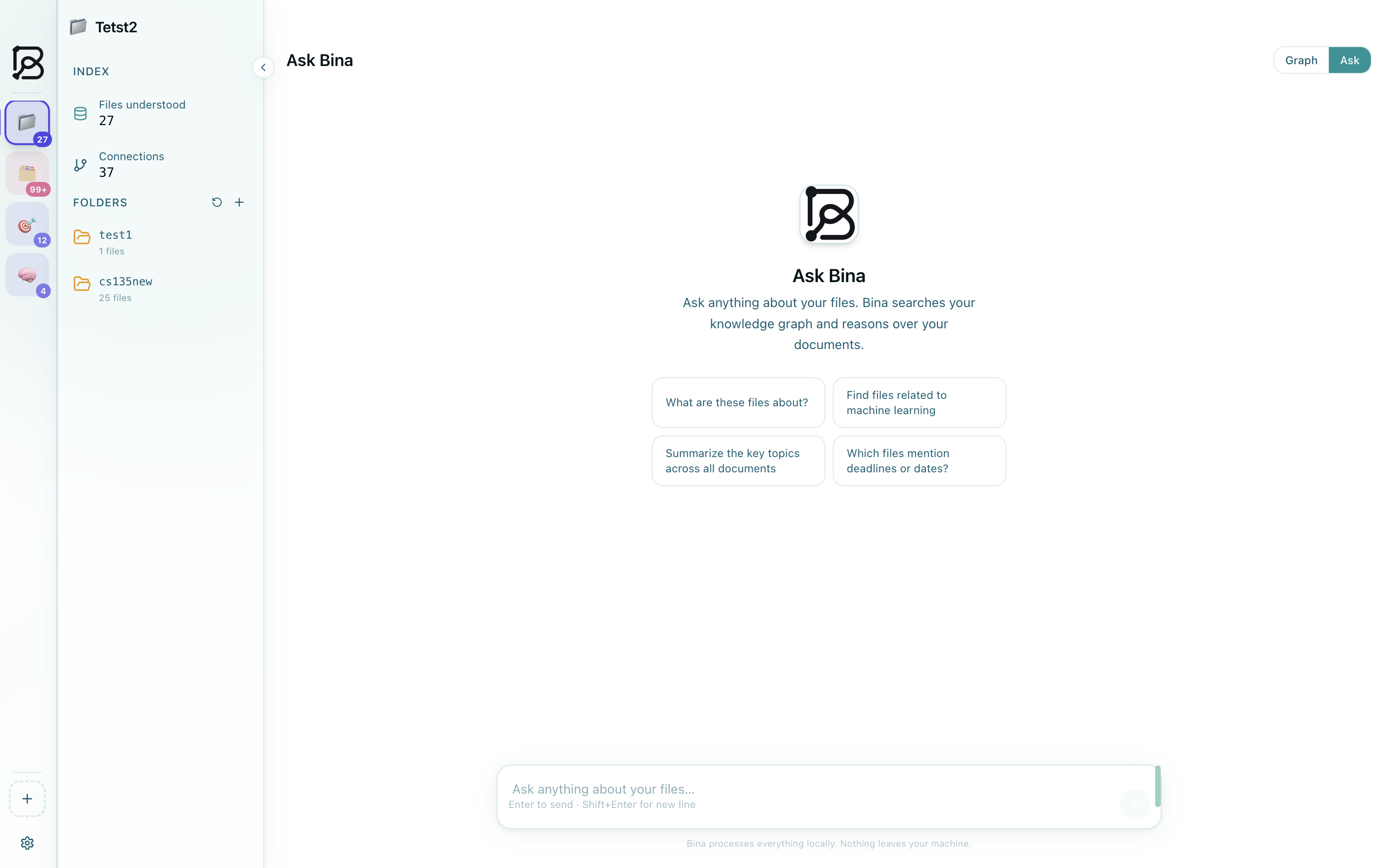 That frustration is what started Bina. We didn't want to build a better file browser or a smarter search bar. We wanted to fix the underlying model entirely. Files shouldn't be isolated objects in a folder hierarchy. They should be nodes in a network of ideas, connected by meaning, explorable like a map of your own thinking.