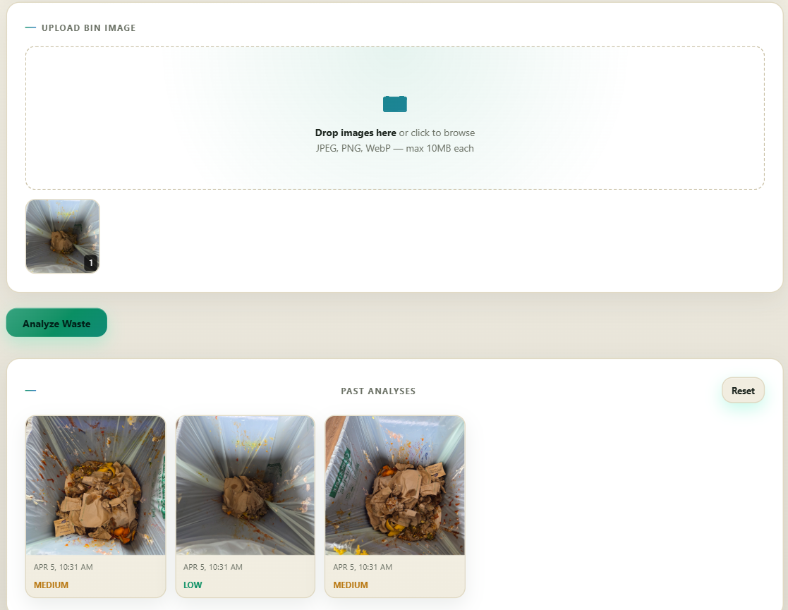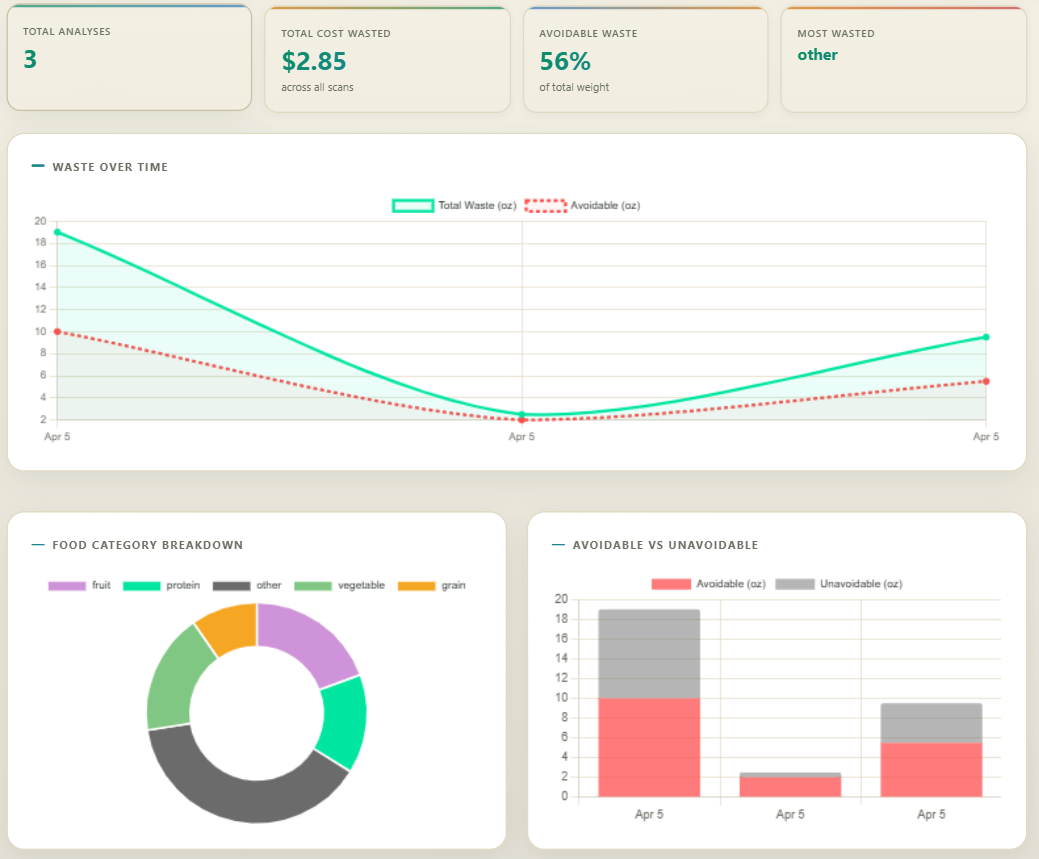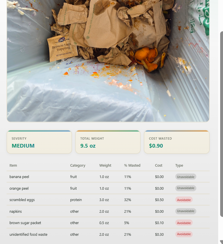 - Instant Waste Analysis: Upload a bin photo and get a full breakdown of every food item, weight, cost, and whether it was avoidable.