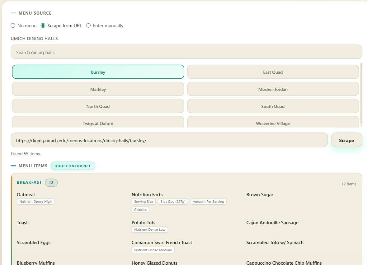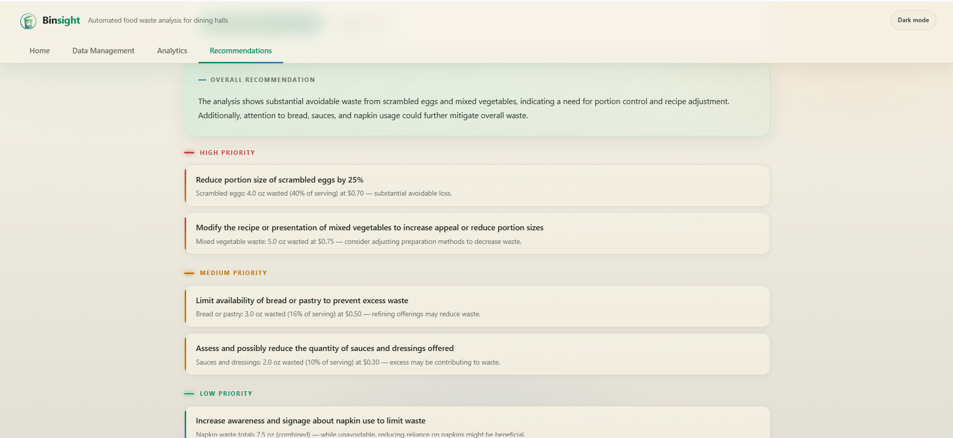 - Automatic Menu Scraping: Binsight pulls the day's menu directly from your dining hall's website, so the LLM knows exactly what was served and can identify waste with precision.