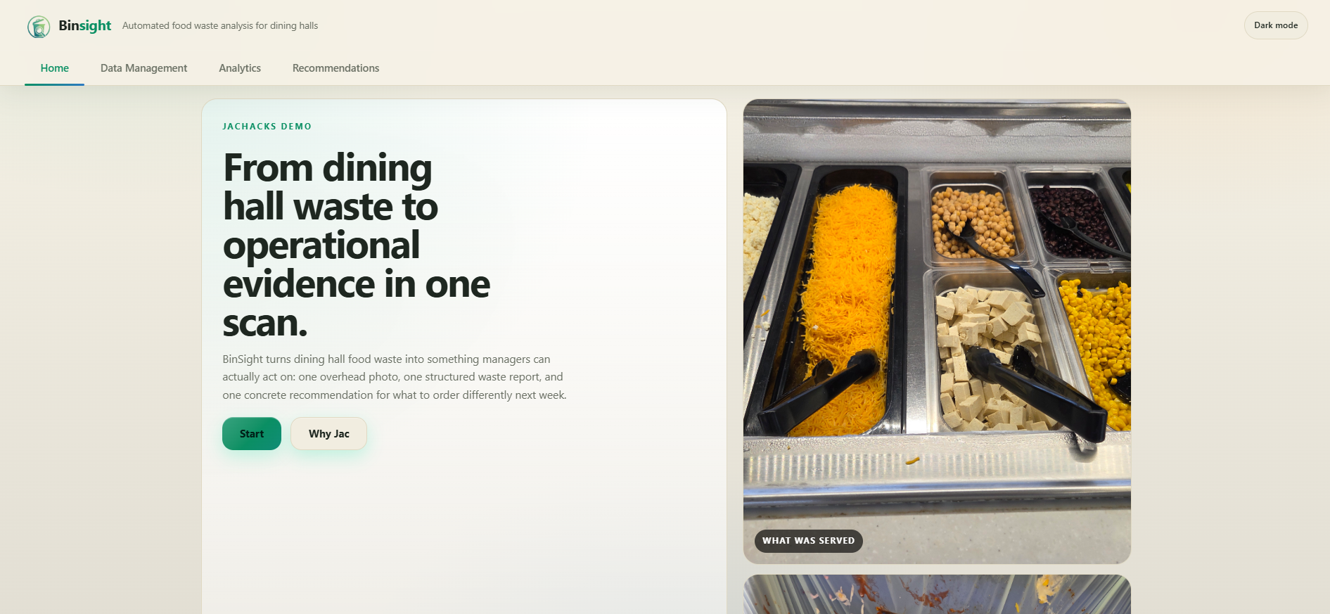 That's why we built Binsight. A quick photo of the bin, and dining hall managers instantly know exactly what's being wasted, what it's costing, and what to order differently next week. Across a semester, Mortis could save thousands of dollars and keep hundreds of meals out of the trash.