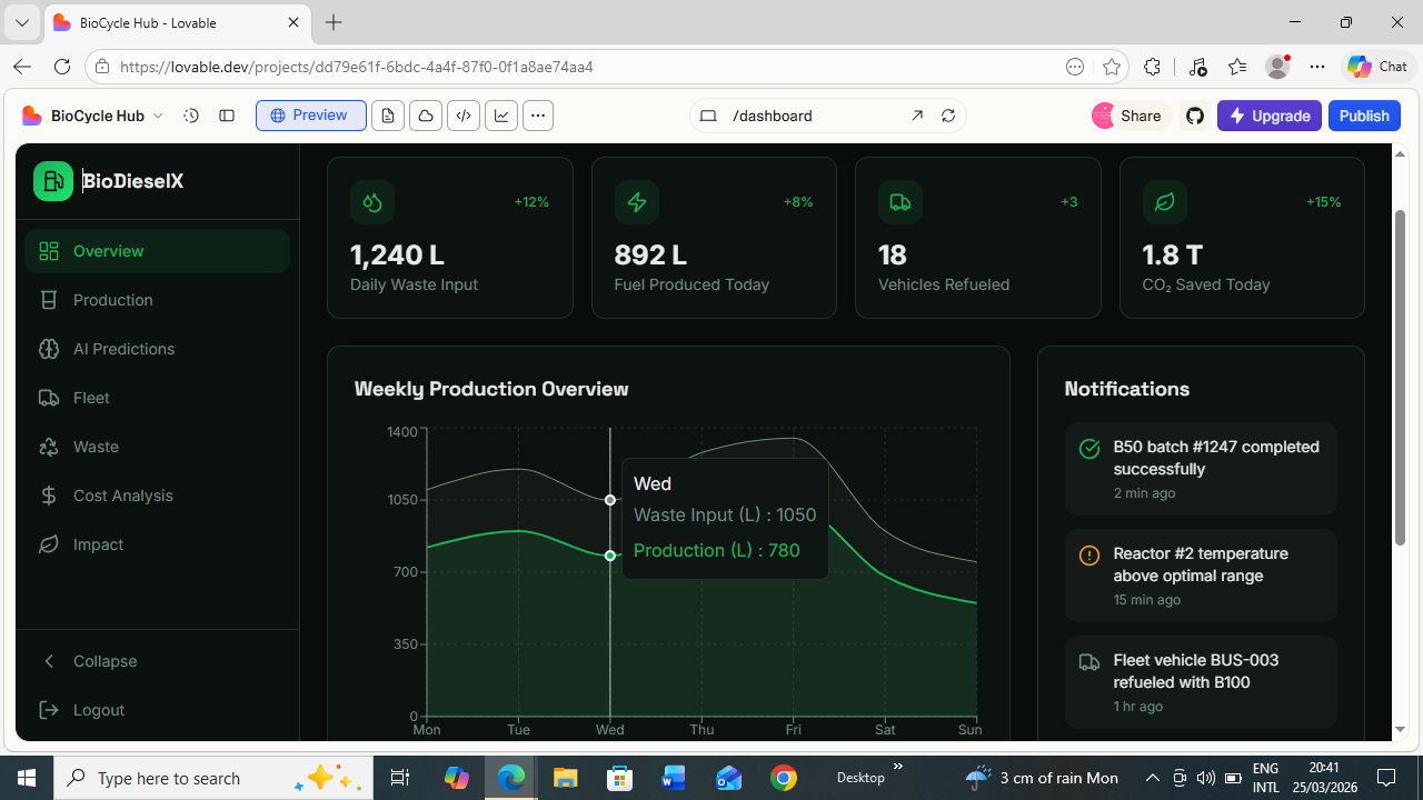 Conversion of waste (used oil, fats) into biodiesel Smart fuel blend recommendations (B20, B50, B100) Real-time fuel cost comparison with diesel A marketplace to connect fuel producers and users