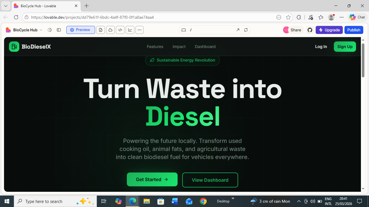 Conversion of waste (used oil, fats) into biodiesel Smart fuel blend recommendations (B20, B50, B100) Real-time fuel cost comparison with diesel A marketplace to connect fuel producers and users