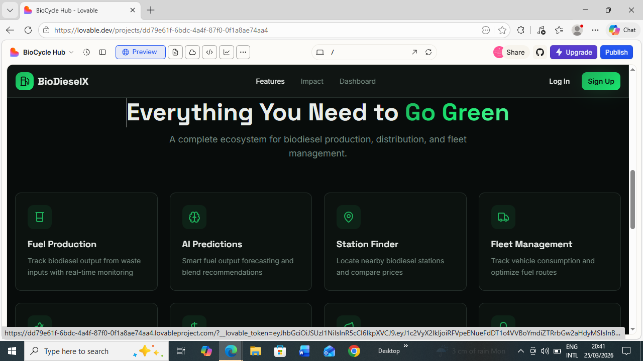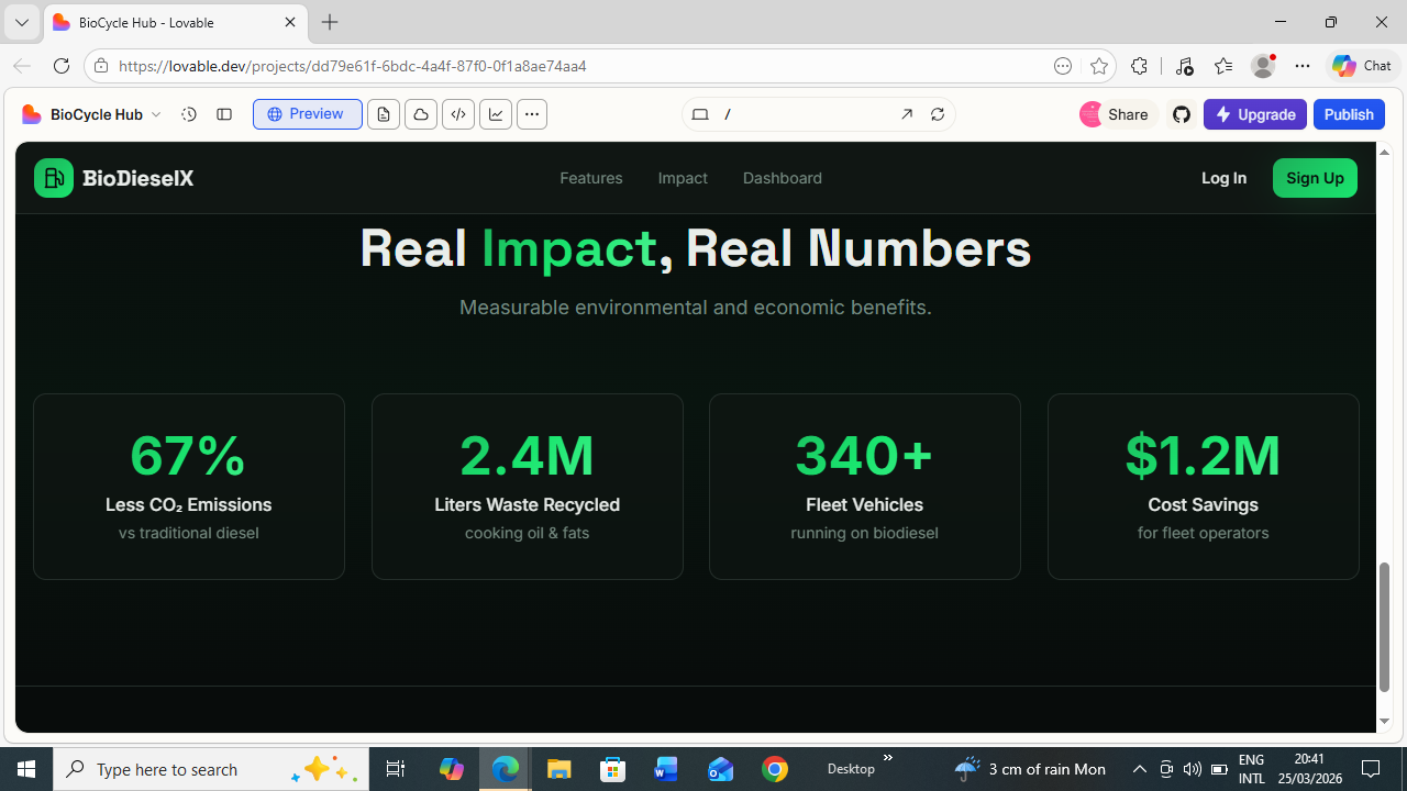 Conversion of waste (used oil, fats) into biodiesel Smart fuel blend recommendations (B20, B50, B100) Real-time fuel cost comparison with diesel A marketplace to connect fuel producers and users