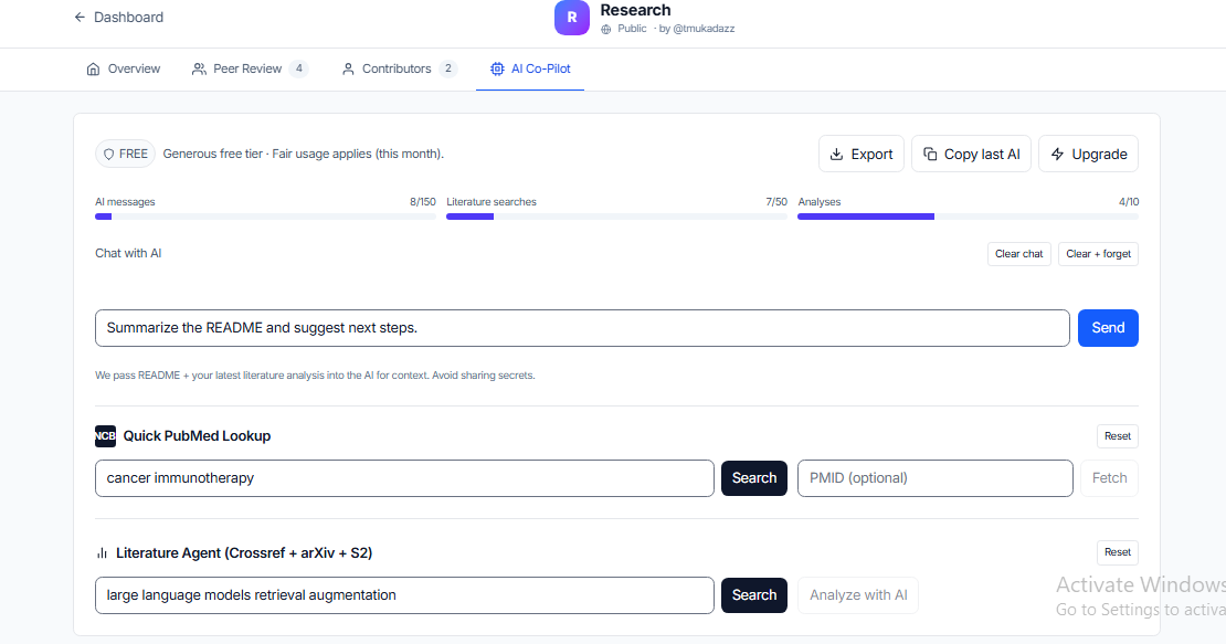 1.Built a working MVP where users have already signed in, created Colabs, and tested AI agents. 2.Validated that AI-assisted literature review saves researchers hours of work. 3.Brought together a multidisciplinary founding team with tech, science, and healthcare expertise. 4.Sparked conversations with researchers and institutions excited about scaling this.