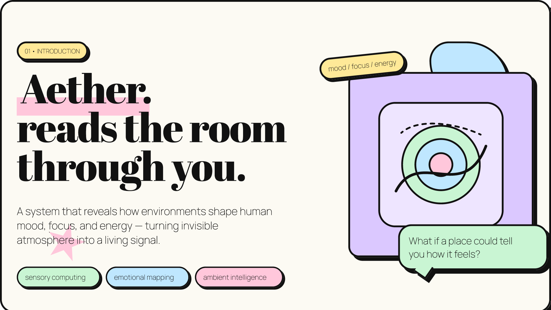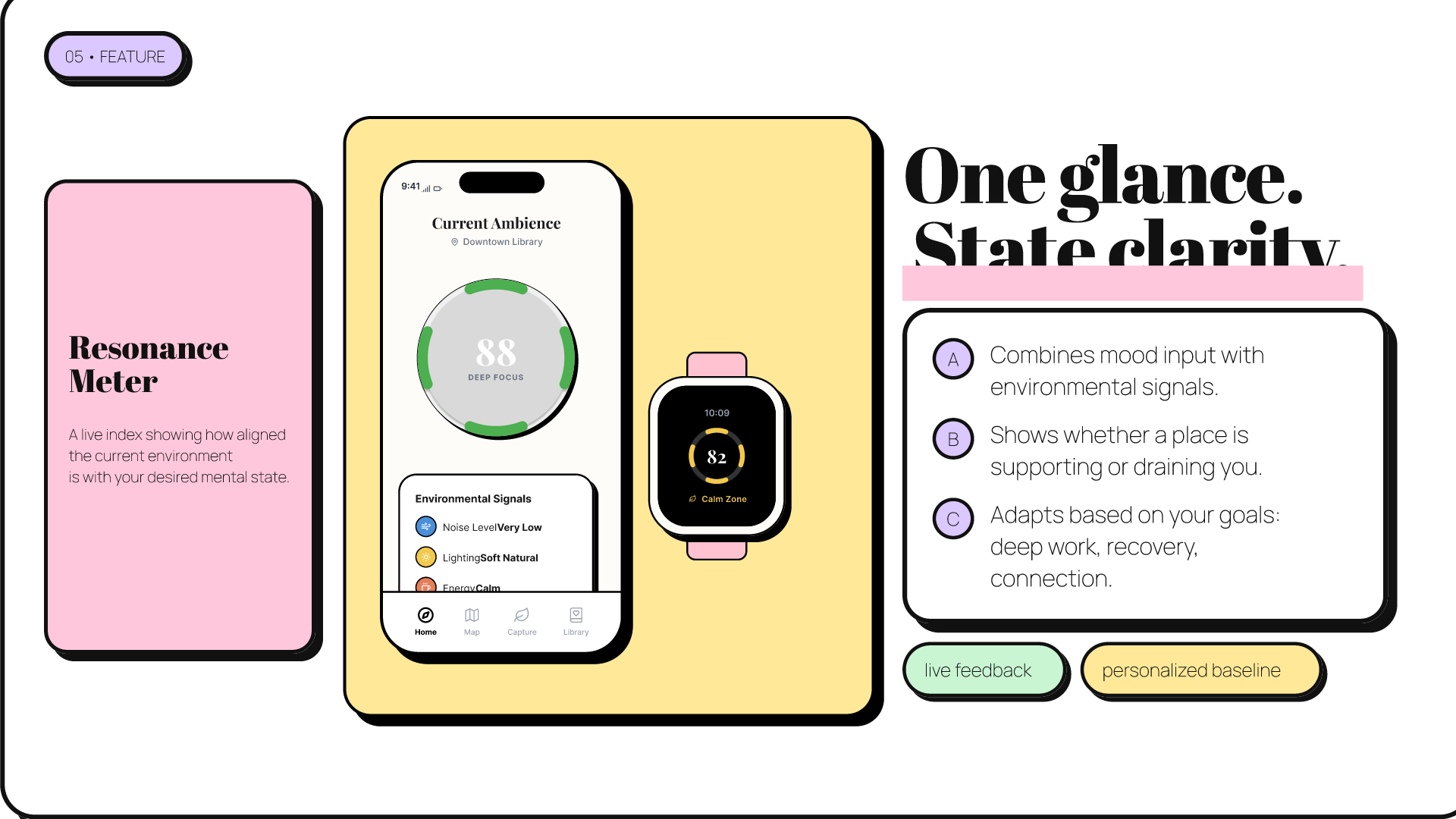 Resonance Meter – When a user enters a space, Aether interprets the surrounding ambience and shows how that environment interacts with the user’s emotional and cognitive state.
