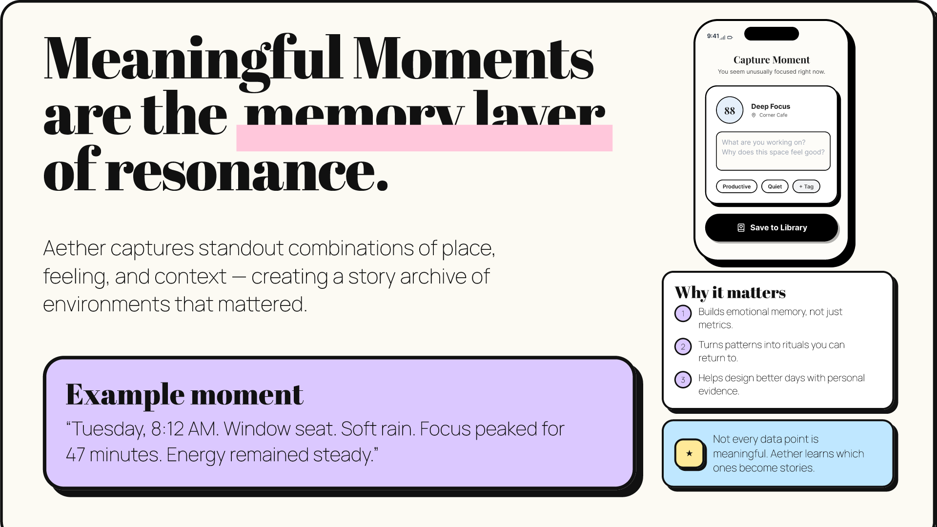 Meaningful Moments – When Aether detects moments where the user feels especially calm, focused, or energized, it prompts them to capture the moment, building a personal archive of environments where they thrive.