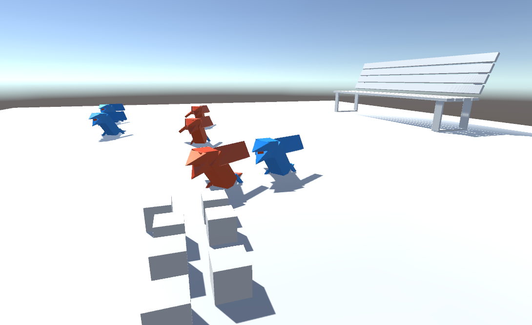 Blue birds are on a timer and if left unfed, will rapidly turn red. Red indicates a hungry bird. Hungry birds are slower and stupider than blue birds and will have trouble keeping up with them. Careful bread throwing is required to ensure birds are fed evenly. Unfed redbirds will turn black and horrible and advance on the player.