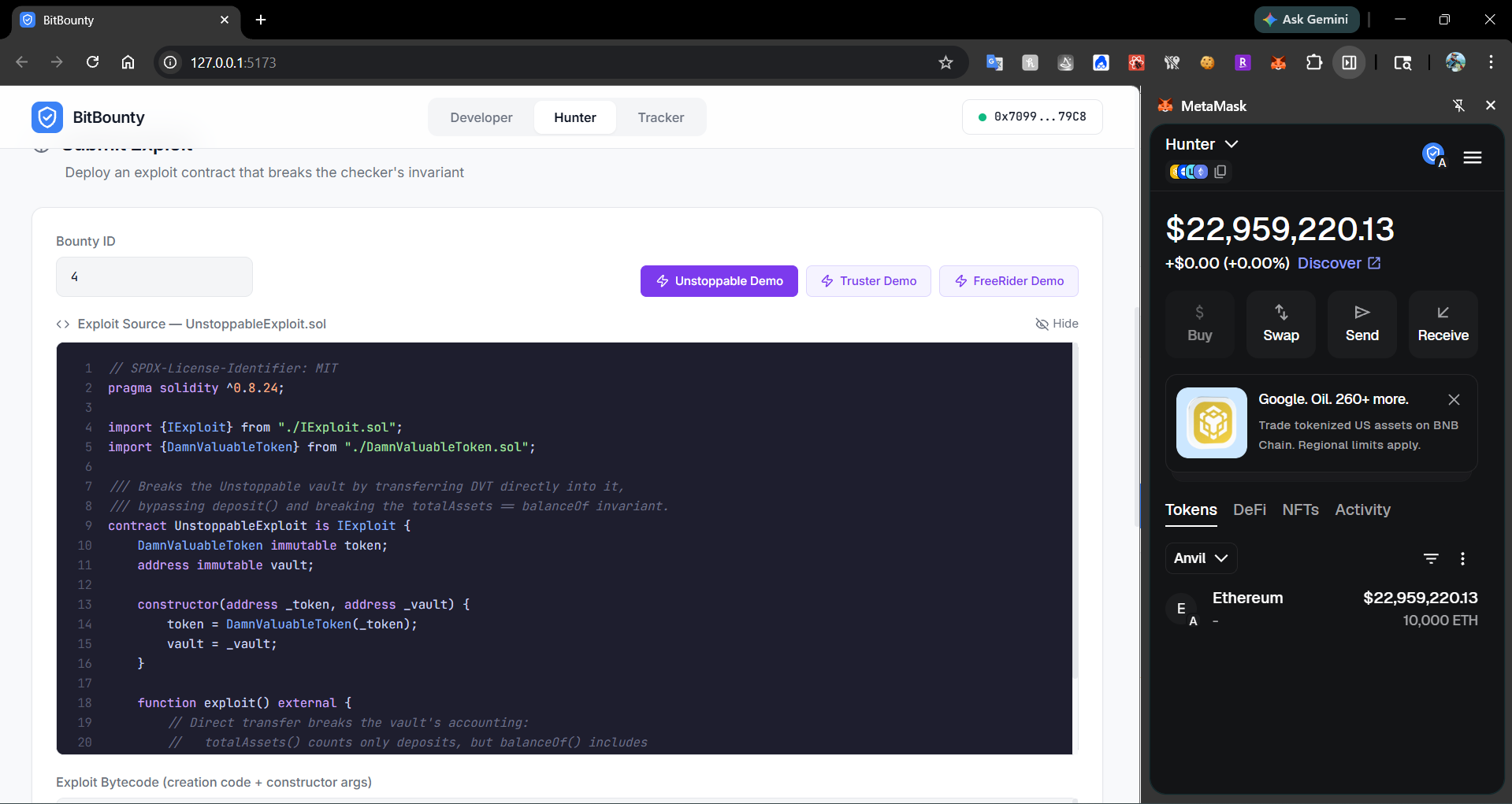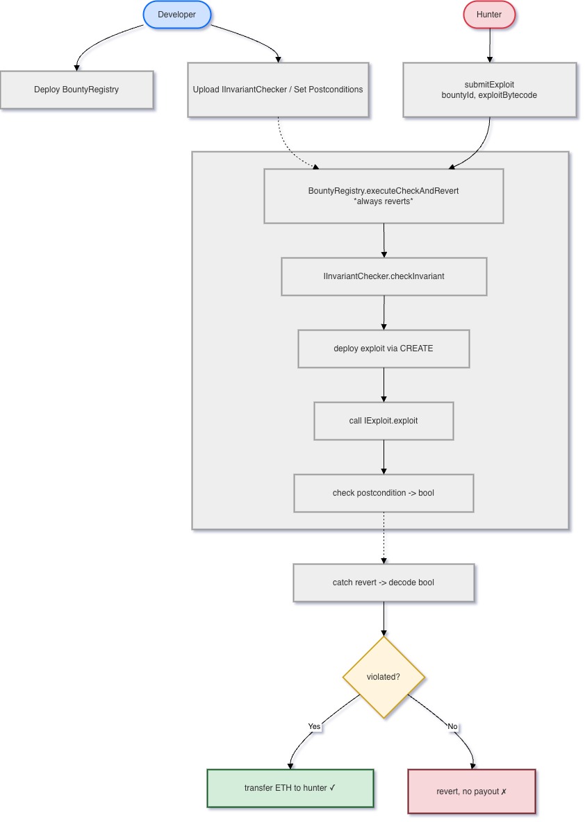 IInvariantCheckerwith a postcondition check. TheBountyRegistryhandles all sandbox/payout logic. Hunters submit raw exploit bytecode that gets deployed and executed inside the sandbox.