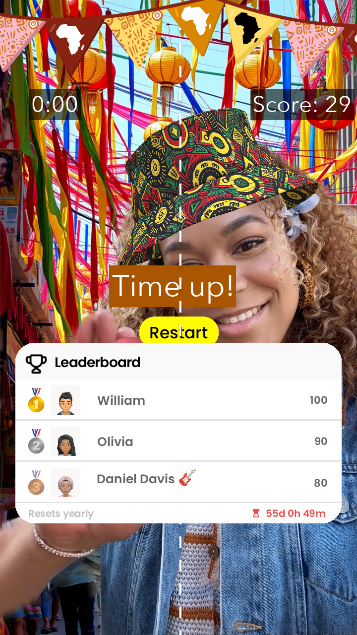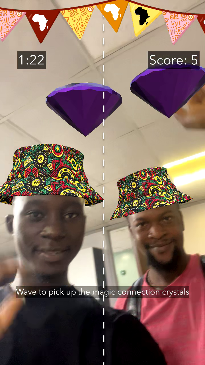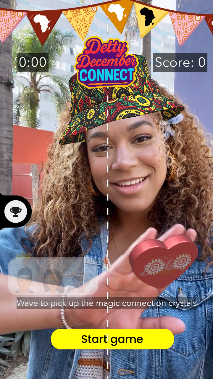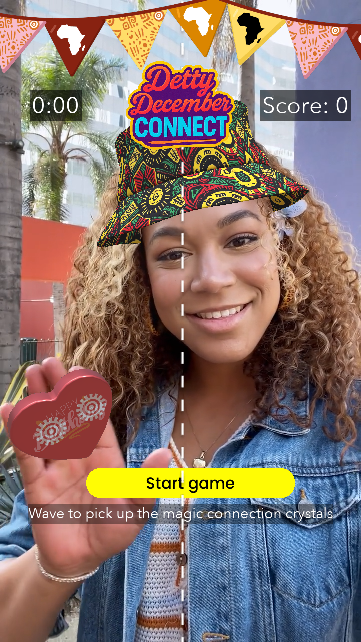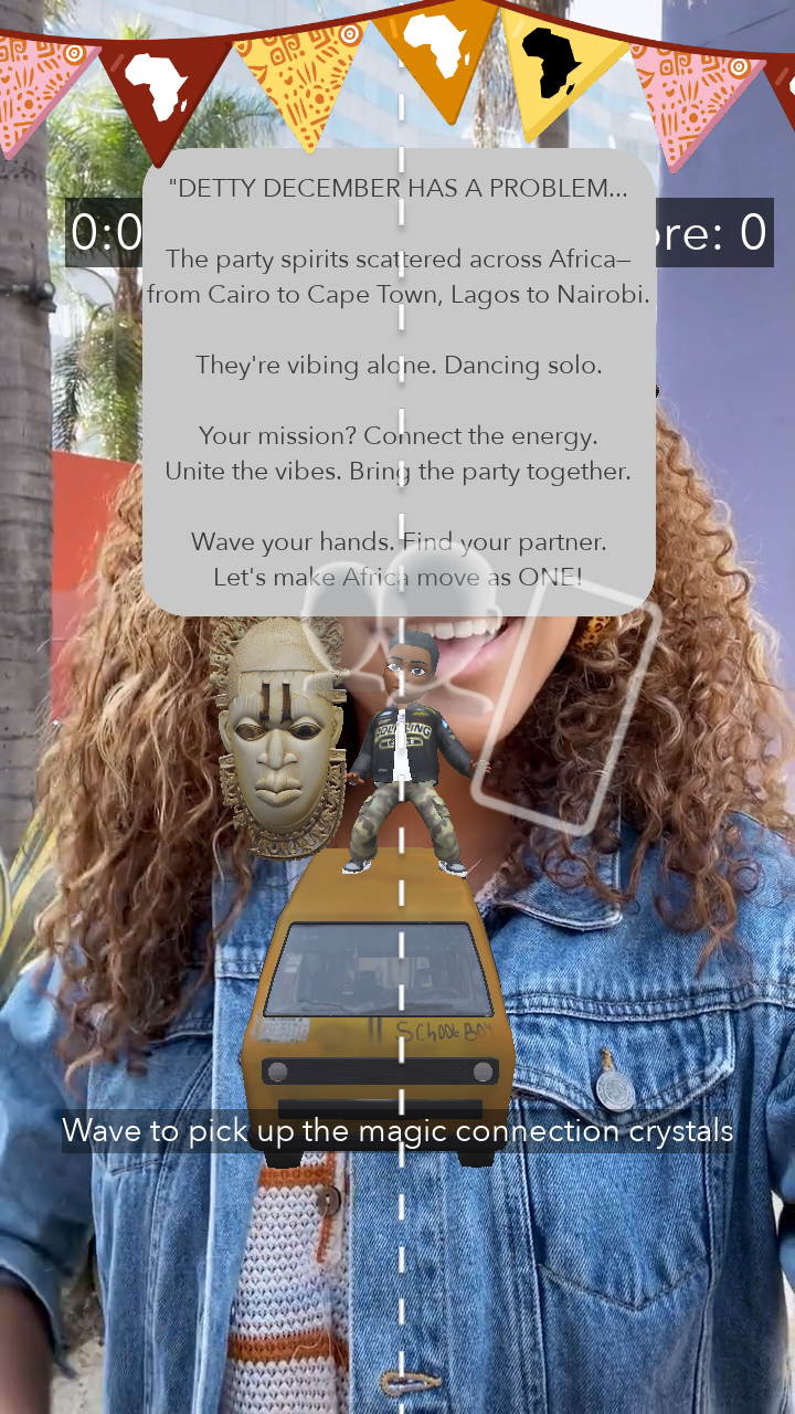 Detty December Connect transforms African philosophy into multiplayer gameplay using advanced hand-tracking. Players begin with "Ubuntu Awakening," an immersive prologue where iconic African landmarks such as the FESTAC mask artifacts and Lagos's Danfo bus materialize and pulse with light as your Bitmoji interacts with them. Text and visual cues reveal Africa's heritage of unity, establishing the emotional foundation for gameplay. Then, two players simultaneously hand-track to collect cultural crystals spawning in a shared AR space. A countdown timer adds urgency as players race to beat the high score. Players earn bonuses by coordinating movements and synchronizing timing. The crystals respond with authentic African drum sounds and vibrant particle effects when collected, creating emergent moments of genuine connection. Players develop hand signals, laugh when they collide, and physically experience Ubuntu philosophy. In this game, players do not just read "we are stronger together," they prove it against the clock.