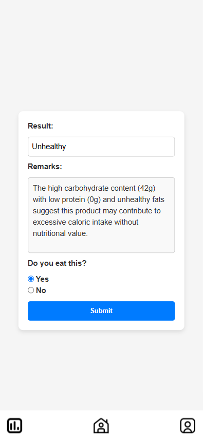 The app captures an image of the nutritional facts of a snack or beverage, extracts the information, and analyzes it using OpenAI’s API. It then provides meaningful insights and recommendations on whether the item is suitable for consumption.
