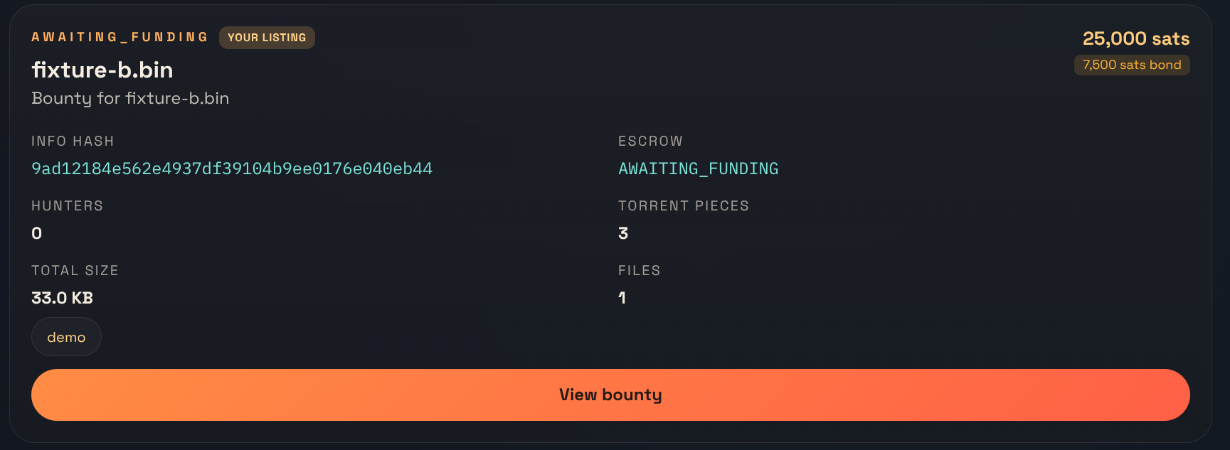 Our original goal was fully decentralized — no escrow server at all, just pure cryptographic proofs between peers. We explored zero-knowledge verification so a hunter could prove file possession without revealing the data, but doing that on-chain was prohibitively expensive and the ZK circuits for torrent piece verification don't exist yet in any practical form. We also tried a workaround using SHA-1 piece hashes directly as commitment schemes, but the computational proof-of-file approach got complicated fast and we couldn't get it reliable within the time limit. We stepped back, accepted a lightweight server role for escrow coordination, and focused on making that system genuinely trustworthy through collateral bonds and cryptographic receipts rather than chasing full decentralization we couldn't ship.