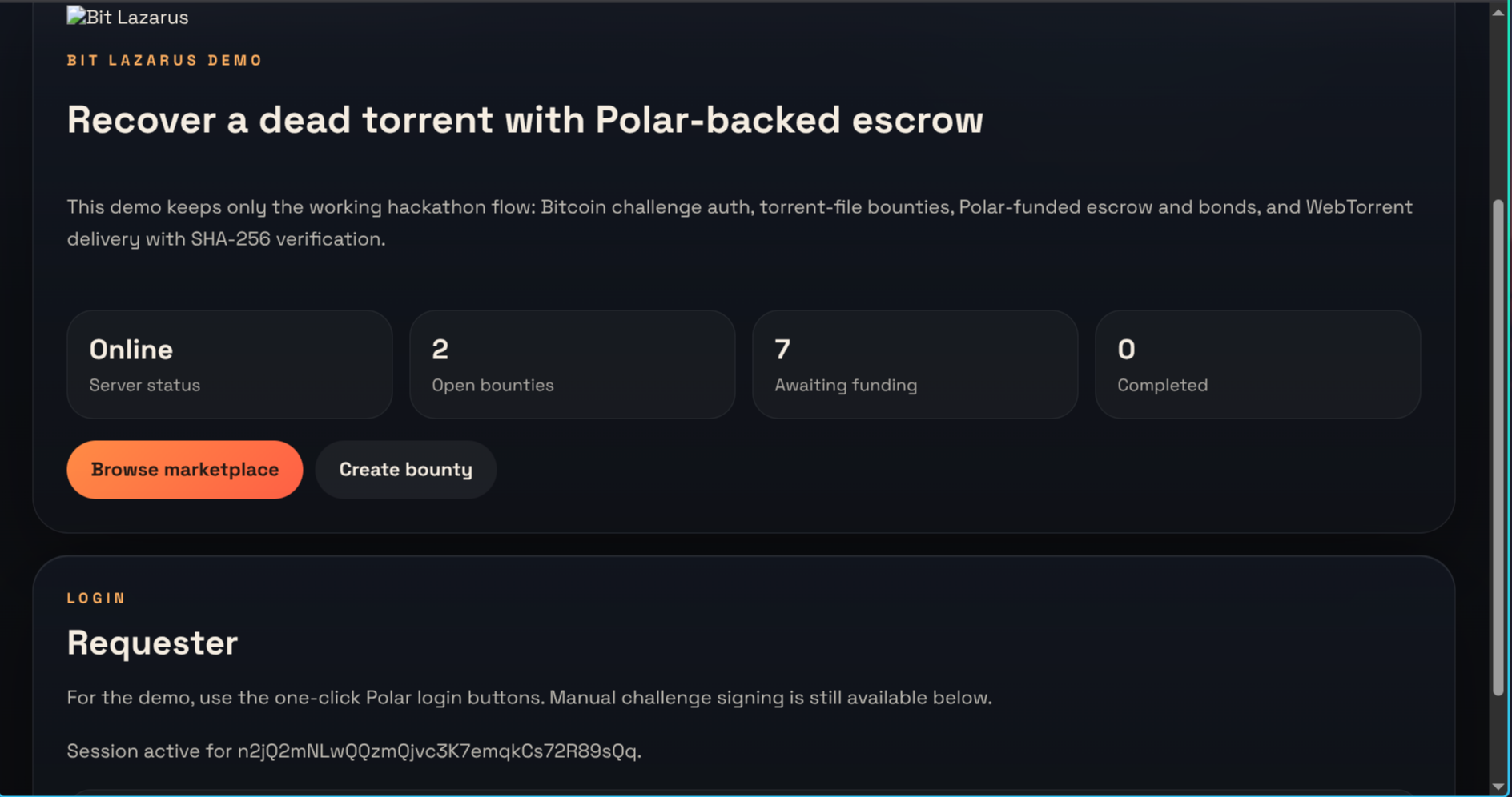Bit Lazarus is a bounty marketplace for dead torrents. You post a bitcoin reward on a torrent that's gone dark, specifying which pieces are missing. Hunters who have the data join the bounty,seed the files back to you, and get paid instantly through Lightning. The payment is locked in a hold invoice (HTLC) with collateral bonds on both sides, so neither party can cheat. If the hunter doesn't deliver, the money returns automatically. No accounts, no passwords - you log in by signing a challenge with your bitcoin wallet. Most importantly, it's not just about getting one file back. Every bounty that gets fulfilled means that data is alive again on the network for everyone.