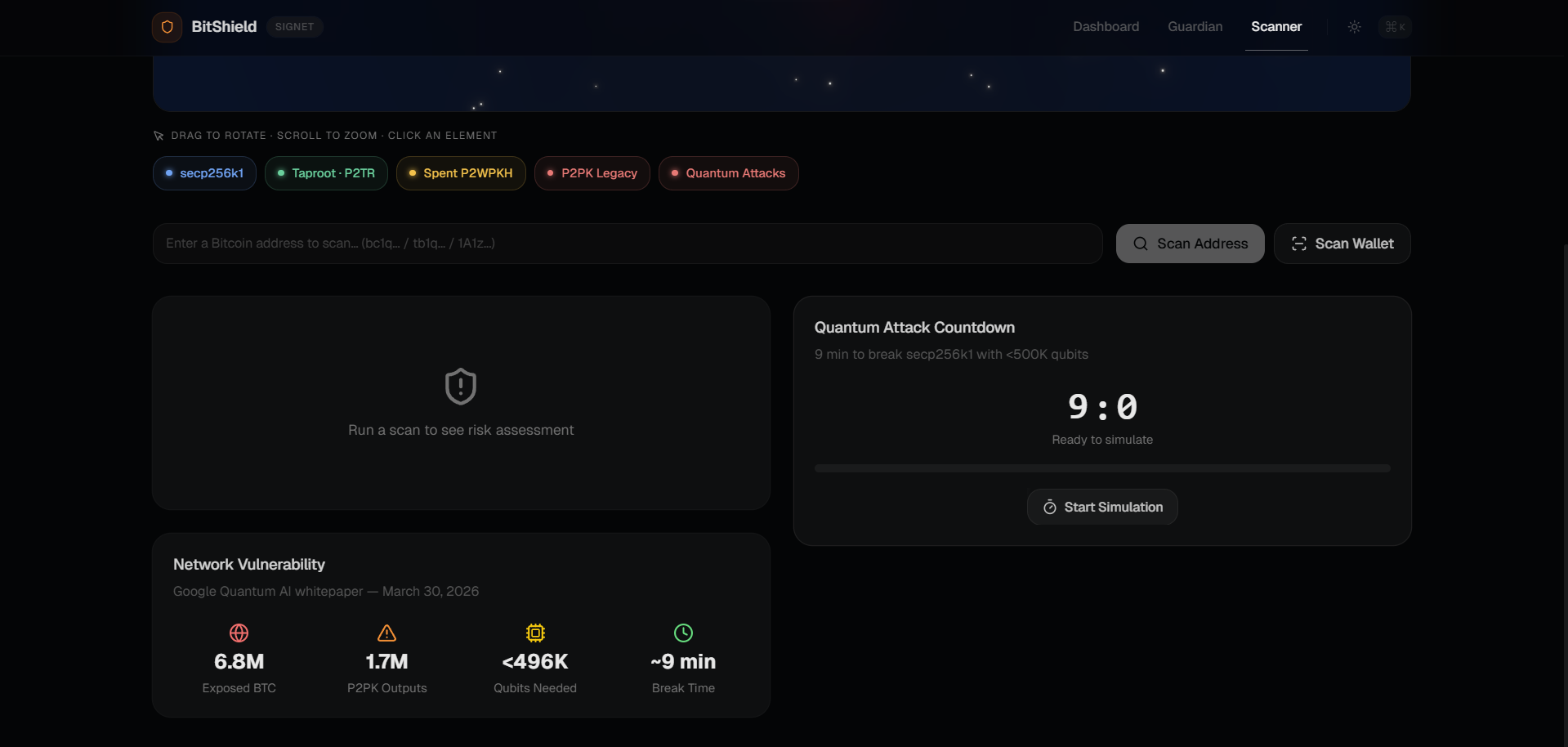 Despite this being the most urgent security challenge in Bitcoin's 17-year history, no tool exists that scans a Bitcoin wallet, classifies each address by quantum vulnerability, and guides the holder through migration.
