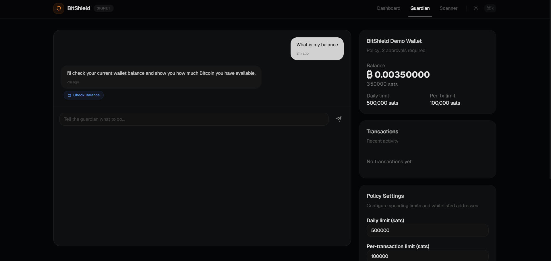 The language model is the UX, not the product. The intelligence lives in the Bitcoin layer: the policy engine, the quantum scanner, the multisig signing logic, and the on-chain anchoring.