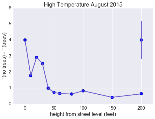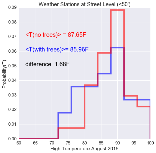 Elevation data are corrected with topographic data to yield comparable measurement heights above street level, providing information about temperature and humidity at several points above and below the tree canopy. Combining this weather data with the TreesCount2015 street tree data set provides a means to parse temperature and humidity data at various heights in the presence or absence of trees, as defined by distance of weather stations from street trees. The initial results suggest a statistically significant reduction of temperature and humidity in the proximity of street trees, especially below the tree canopy.