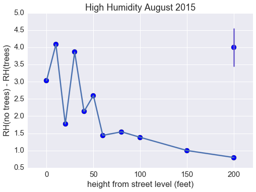 The next plots show the difference in temperature and humidity between stations without trees and stations with trees in their proximity, at different elevations from the street. As expected, the difference is the greatest closer to the street level, and tends to disappear for stations located above canopies.