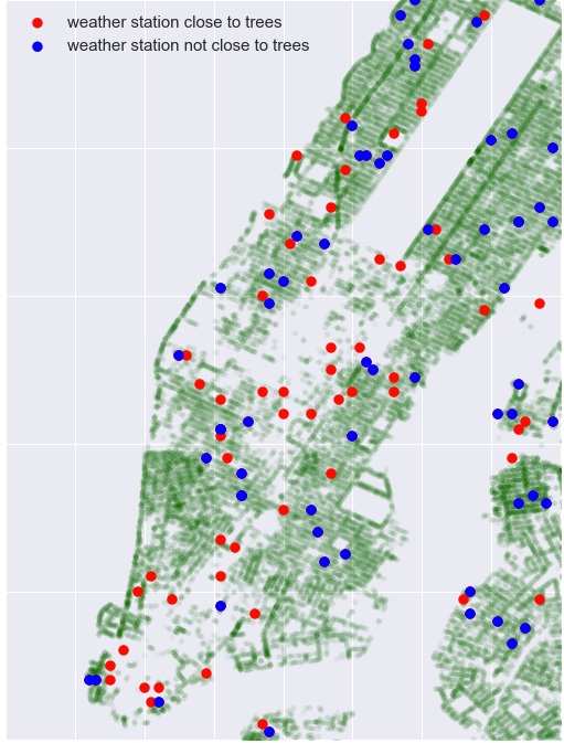 Weather Stations and the tree census (zoom in lower Manhattan). Stations in the proximity of trees are coded in blue, stations away from trees are coded in red