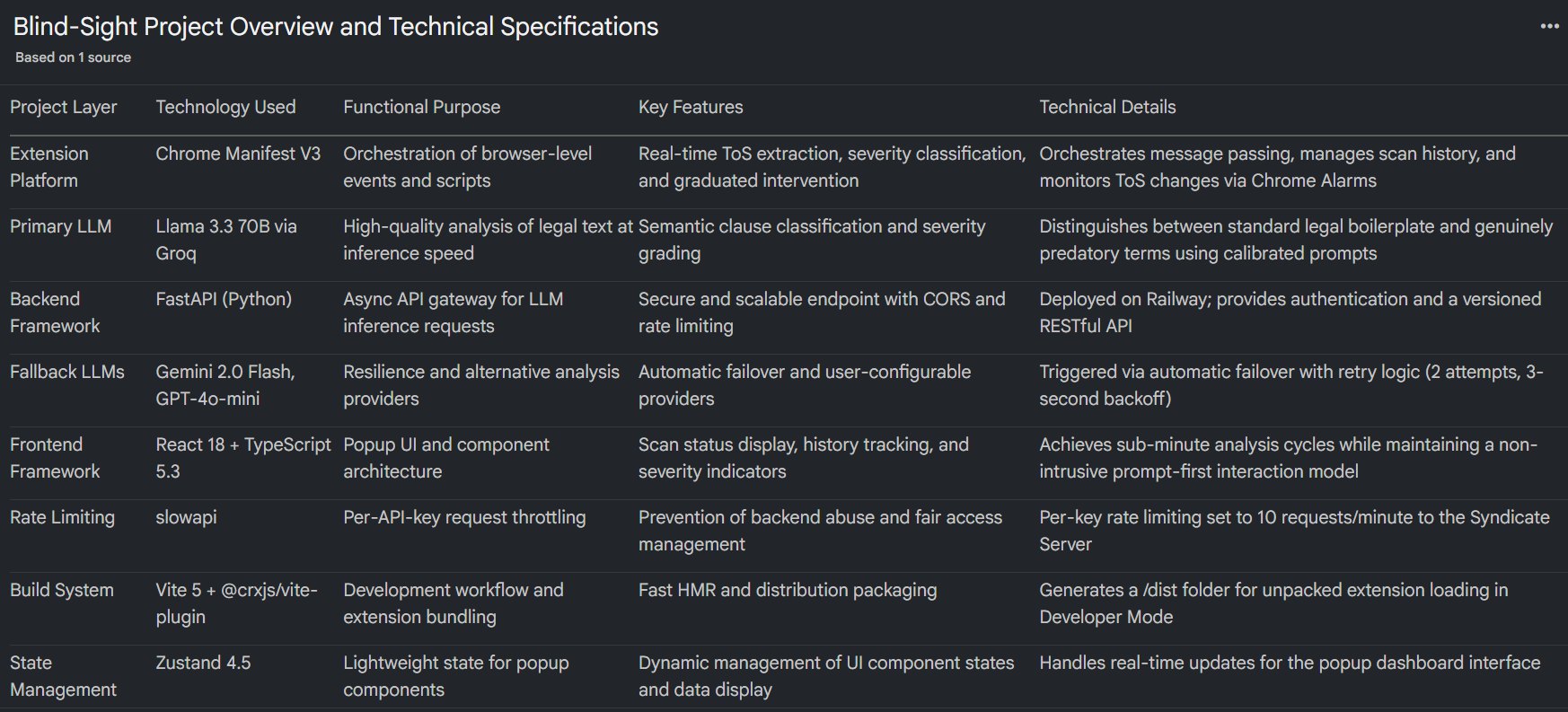 Shows the full technical architecture of Blind-Sight. It explains the FastAPI, LLM models, rate limiting, and deployment structure.