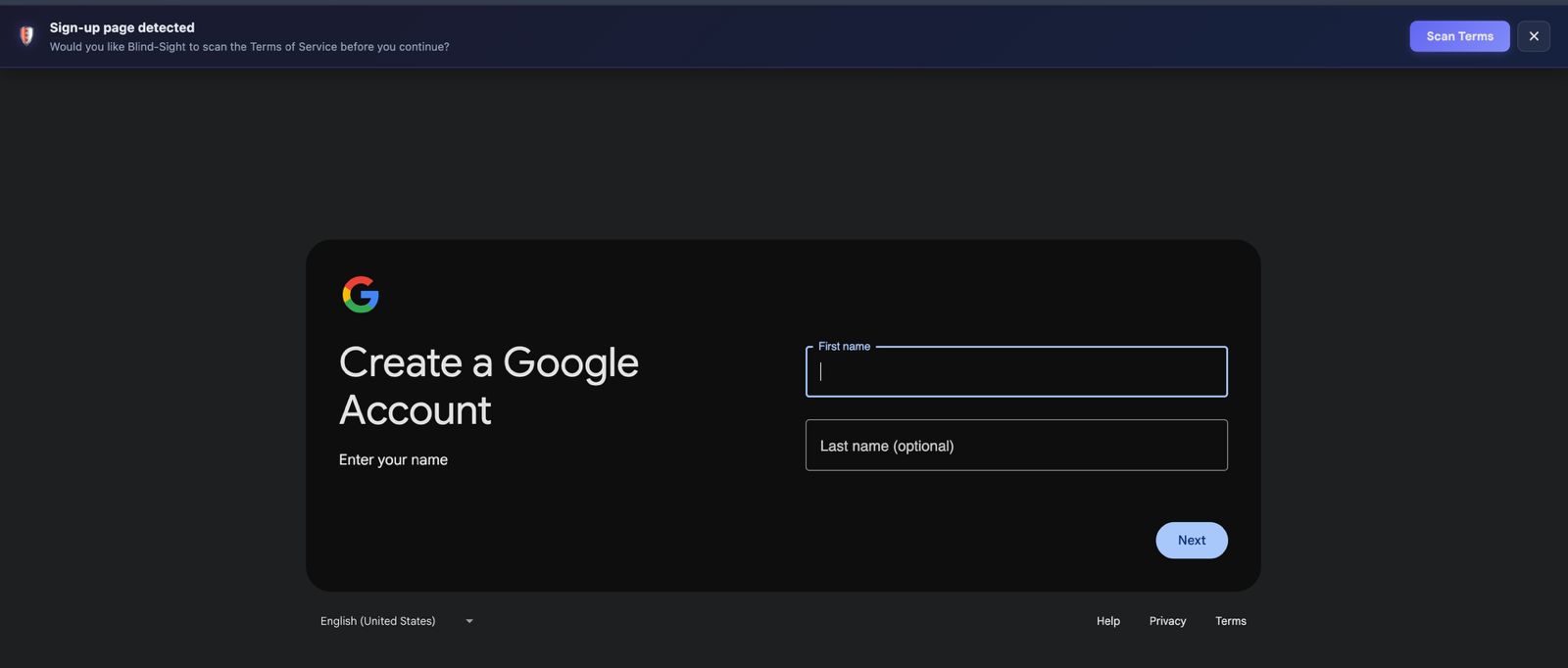 When you land on a sign-up or login page, BLINDSIGHT: