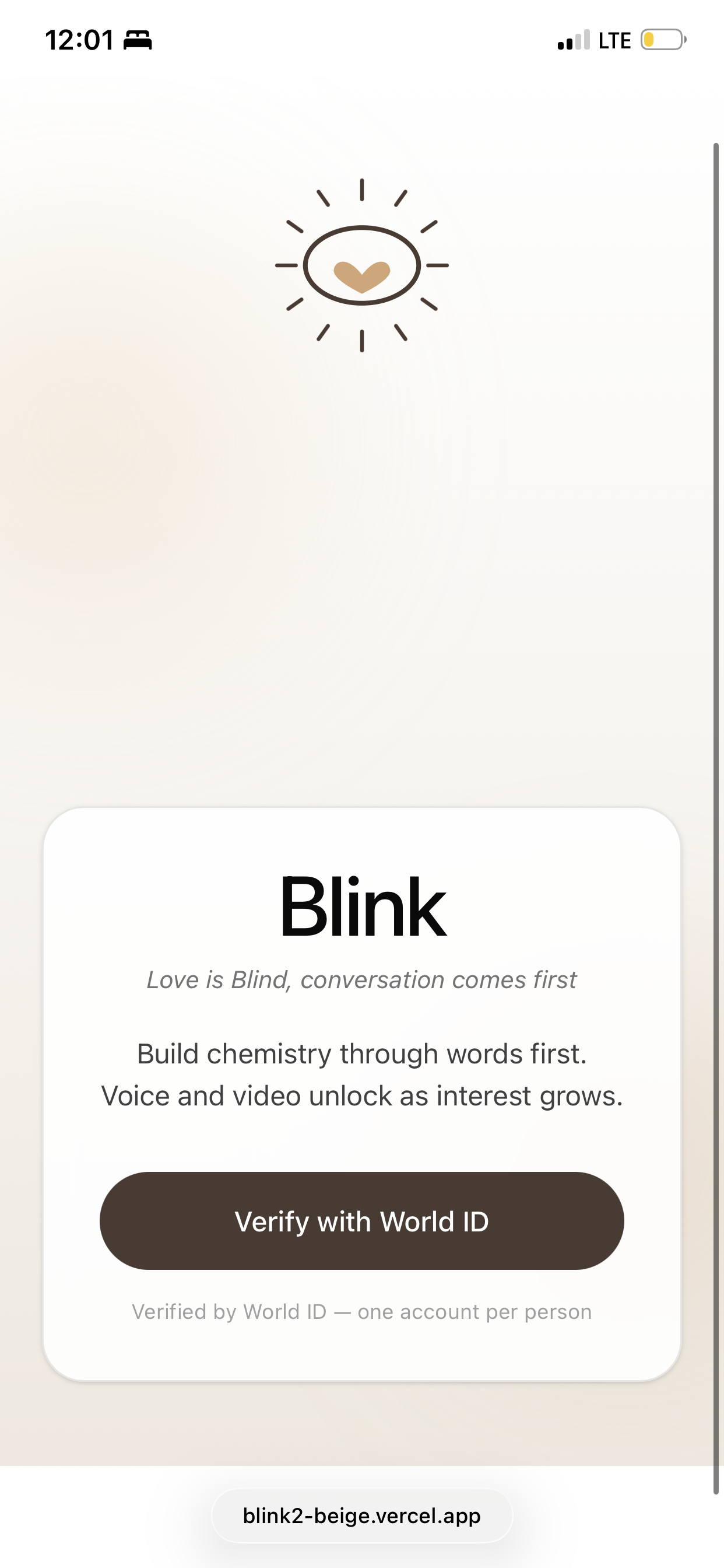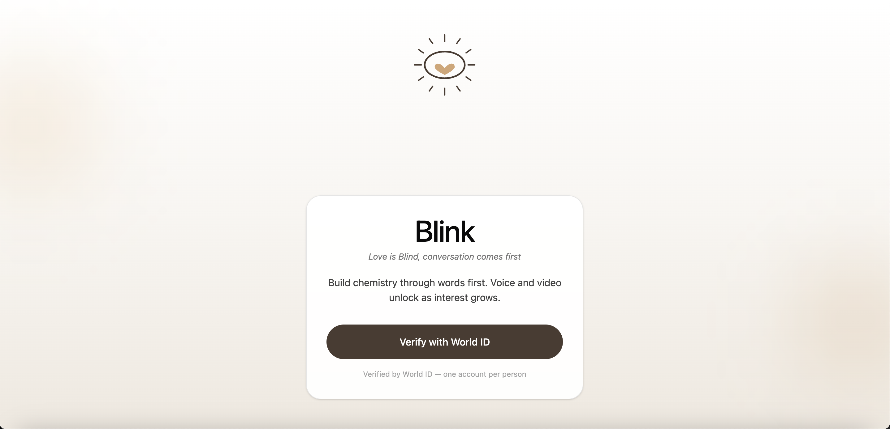 Blink is a virtual blind date. Instead of leading with appearance or endless swiping, Blink matches real humans based on personality, values, and compatibility first. Users start by verifying their identity through World ID to ensure authenticity, then fill out preferences and answer deep and fun questions that gauge personality and relationship needs for better matching. To avoid decision fatigue, Blink provides only one curated match per day. The relationship gradually unlocks different communication levels, starting with text, then voice calls, video calls, and eventually profile photos, only if the connection develops successfully. After each conversation stage, both users decide whether to move forward or move on.