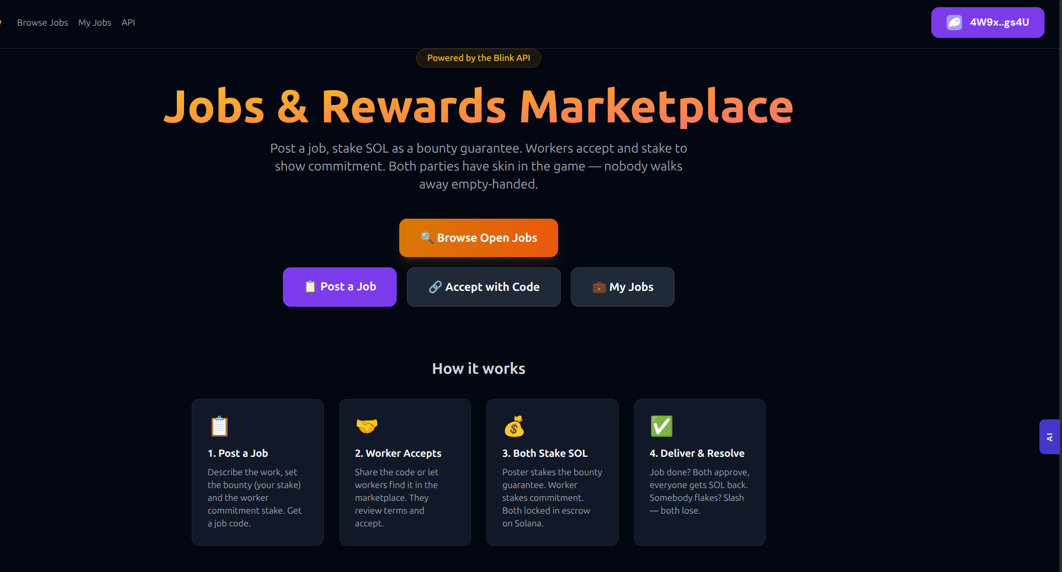 Blink API is a "trust-as-a-service" engine. It allows developers to deploy secure, on-chain Solana escrow rooms with a single REST call. It supports Direct Mode for crypto-native users signing with their own wallets and Custodial Mode for everyone else, allowing users to stake funds via Stripe while the API handles the blockchain heavy lifting.
