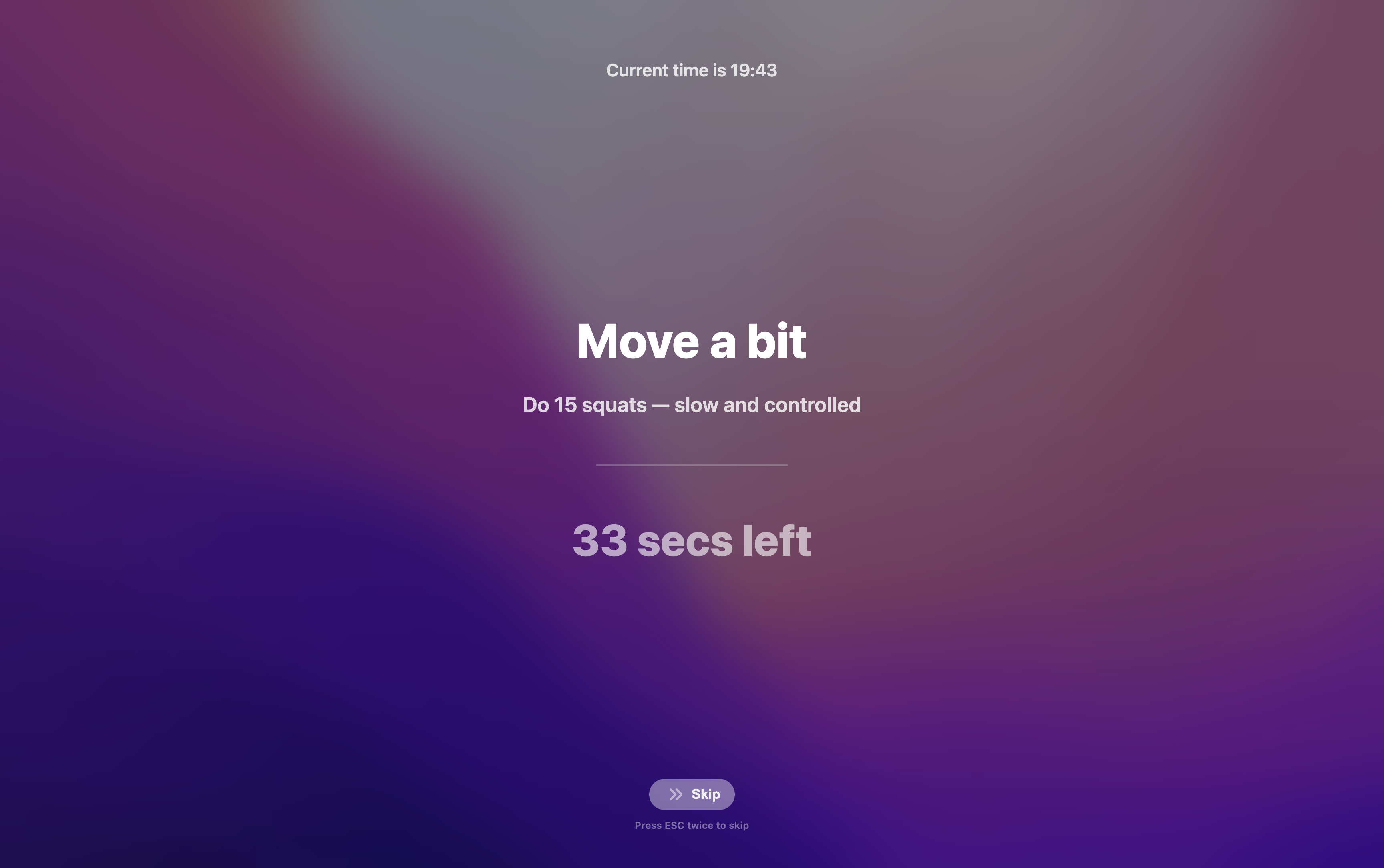 When the break starts, Blinky opens a full-screen rest window that can’t be closed during the countdown. Each break also shows a random “micro-task” like: • relax your eyes and look into the distance • blink a few times • stretch • do a couple of pushups • drink water