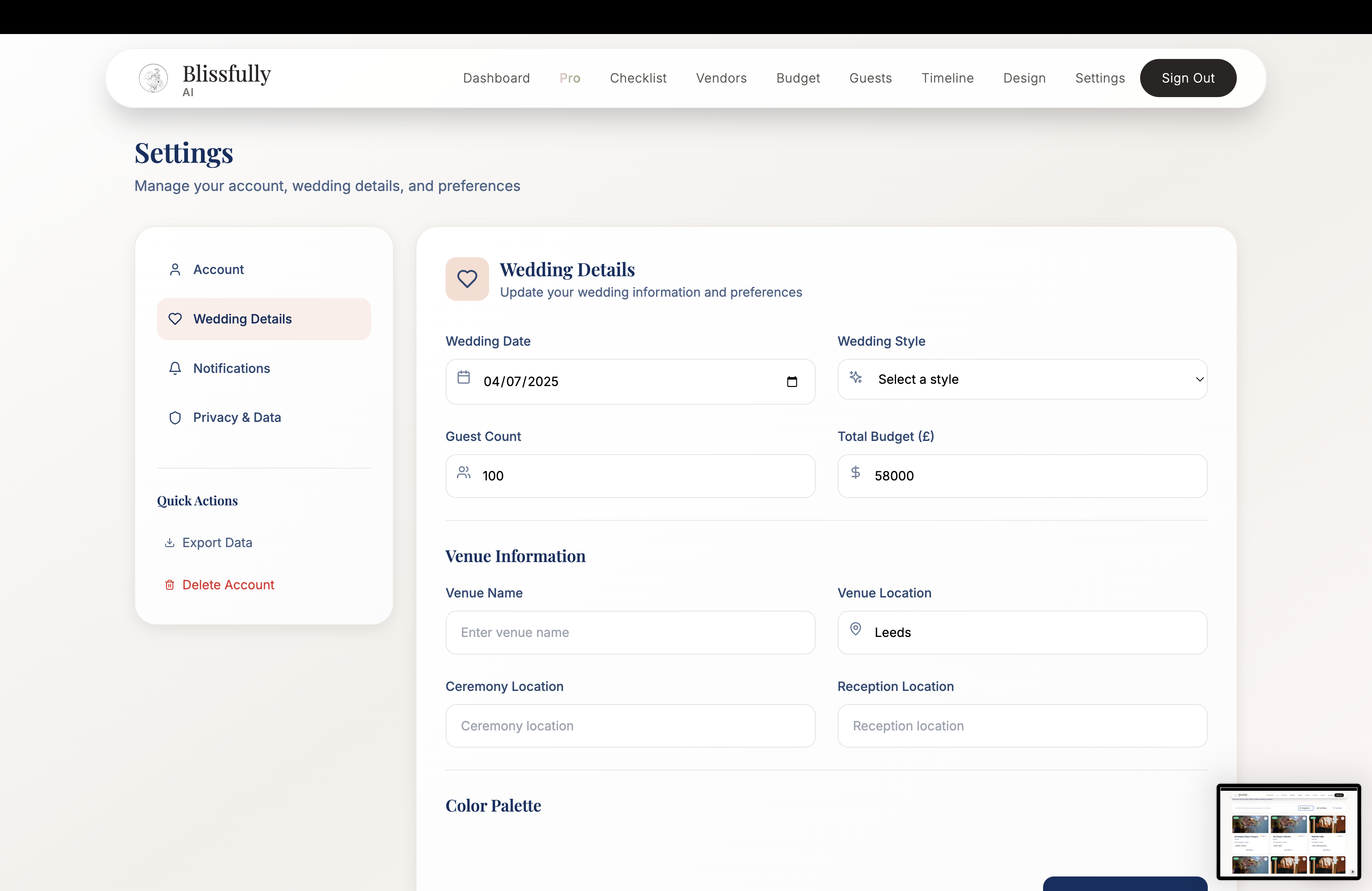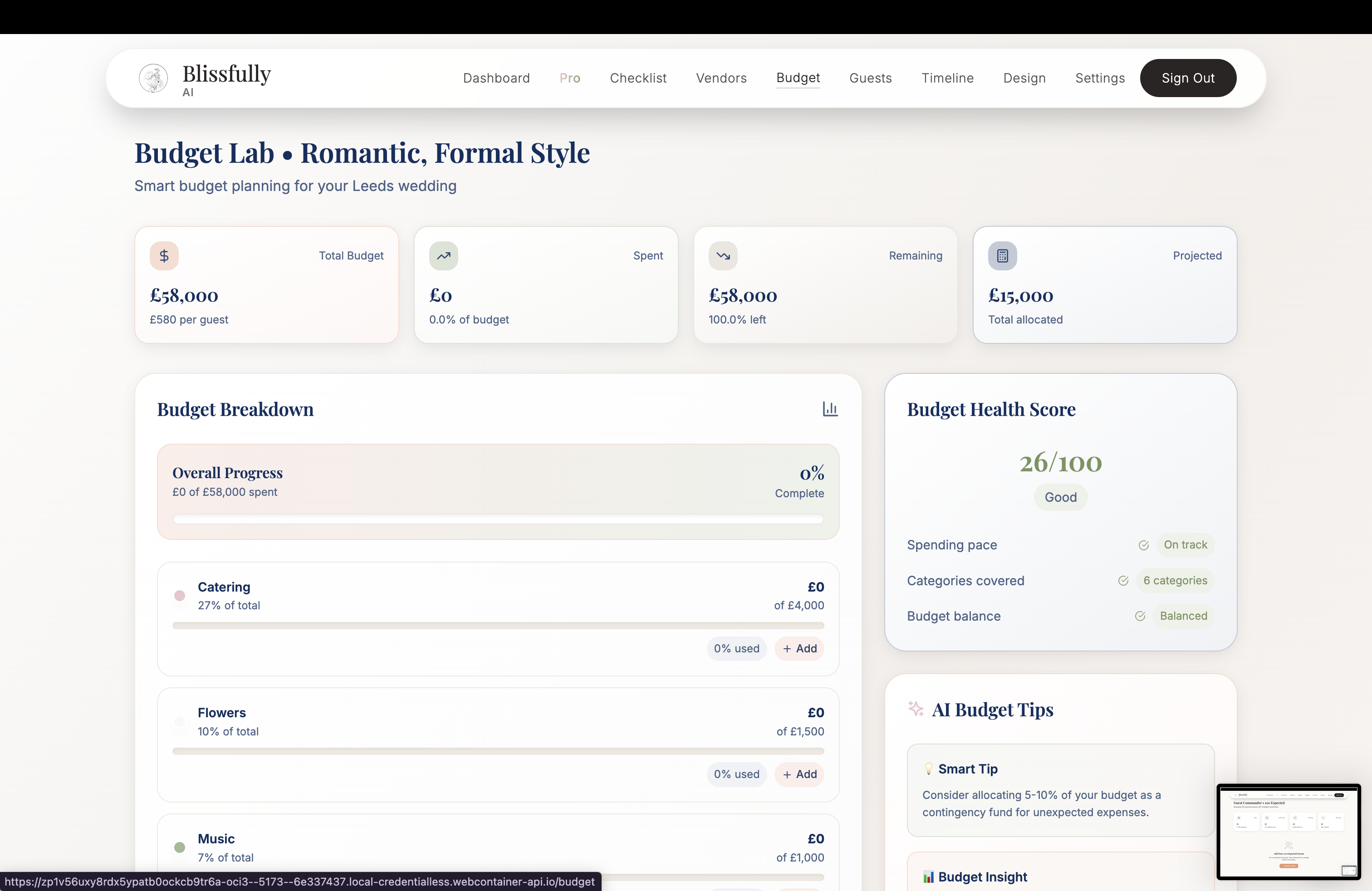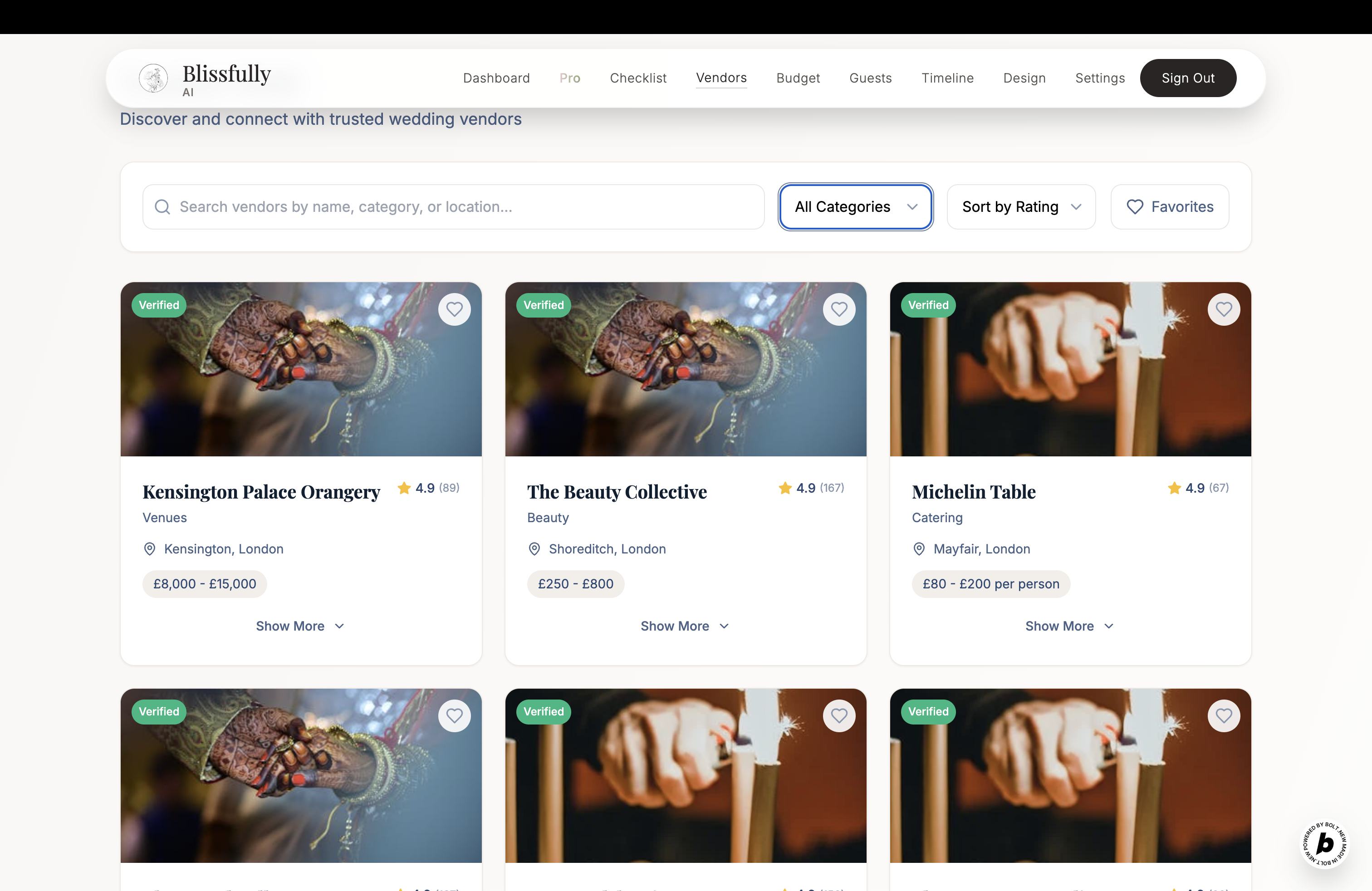 blissfully ai is a very helpful platform to organise your wedding, but the supercharged AI functionality we have added is the automated, unbiased wedding research. like, it looks for vendors, checks prices, helps with the budget, and even tries to get you a deal. it’s not just a list of people who paid to be on the platform (like all the competitors). it actually checks everywhere. you just tell it what you want and it sorts it out.