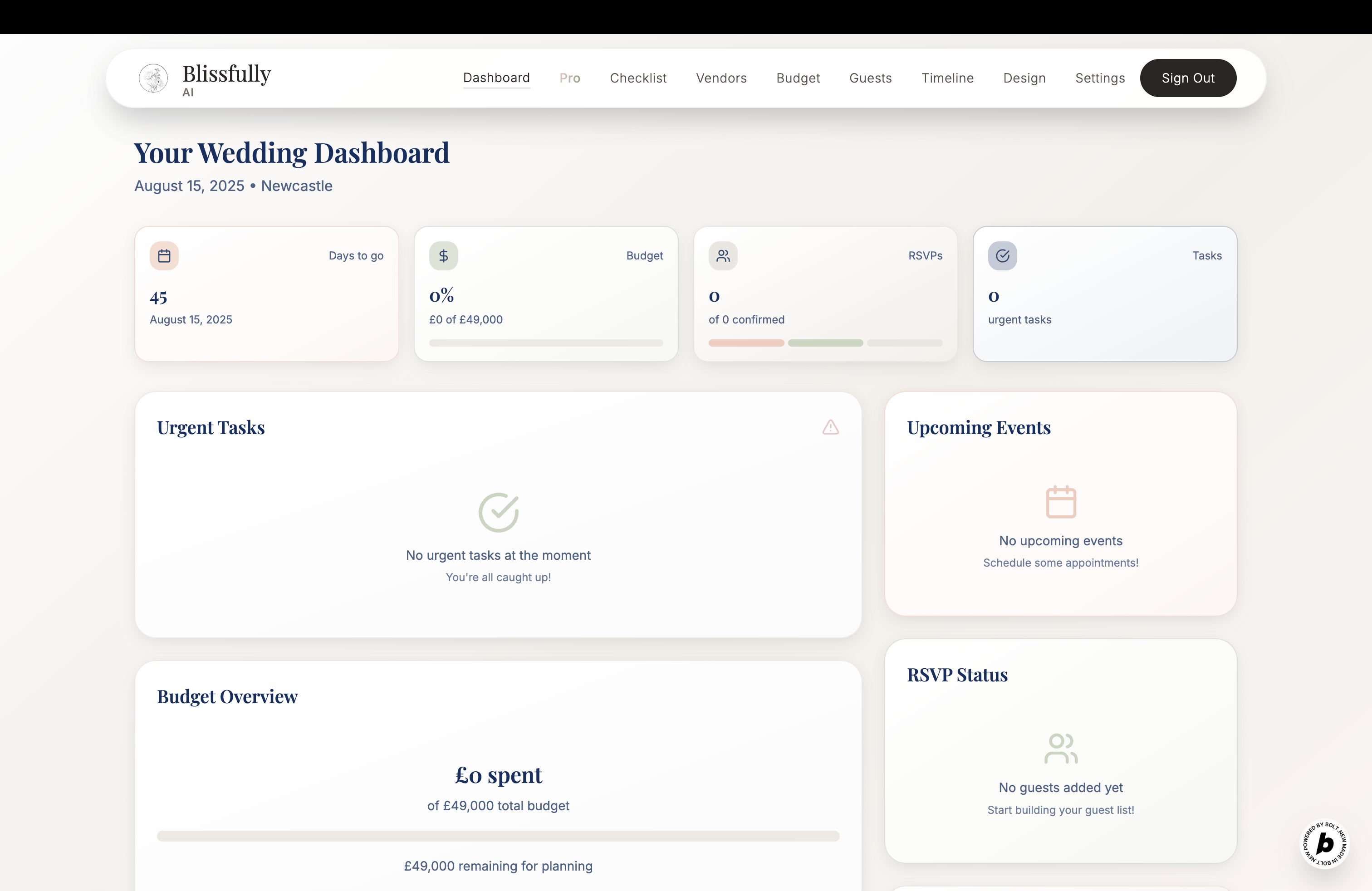 so i got engaged (yay!) but i had no idea what to do next. and then realised planning a wedding is actually just a bunch of googling and spreadsheets and stress. every site i tried just showed me the same vendors, and half of them weren’t even available. honestly, i just wanted to have fun and not spend hours emailing people. so i thought, why isn’t there a thing that just does all the boring bits for you? that’s why i made this.