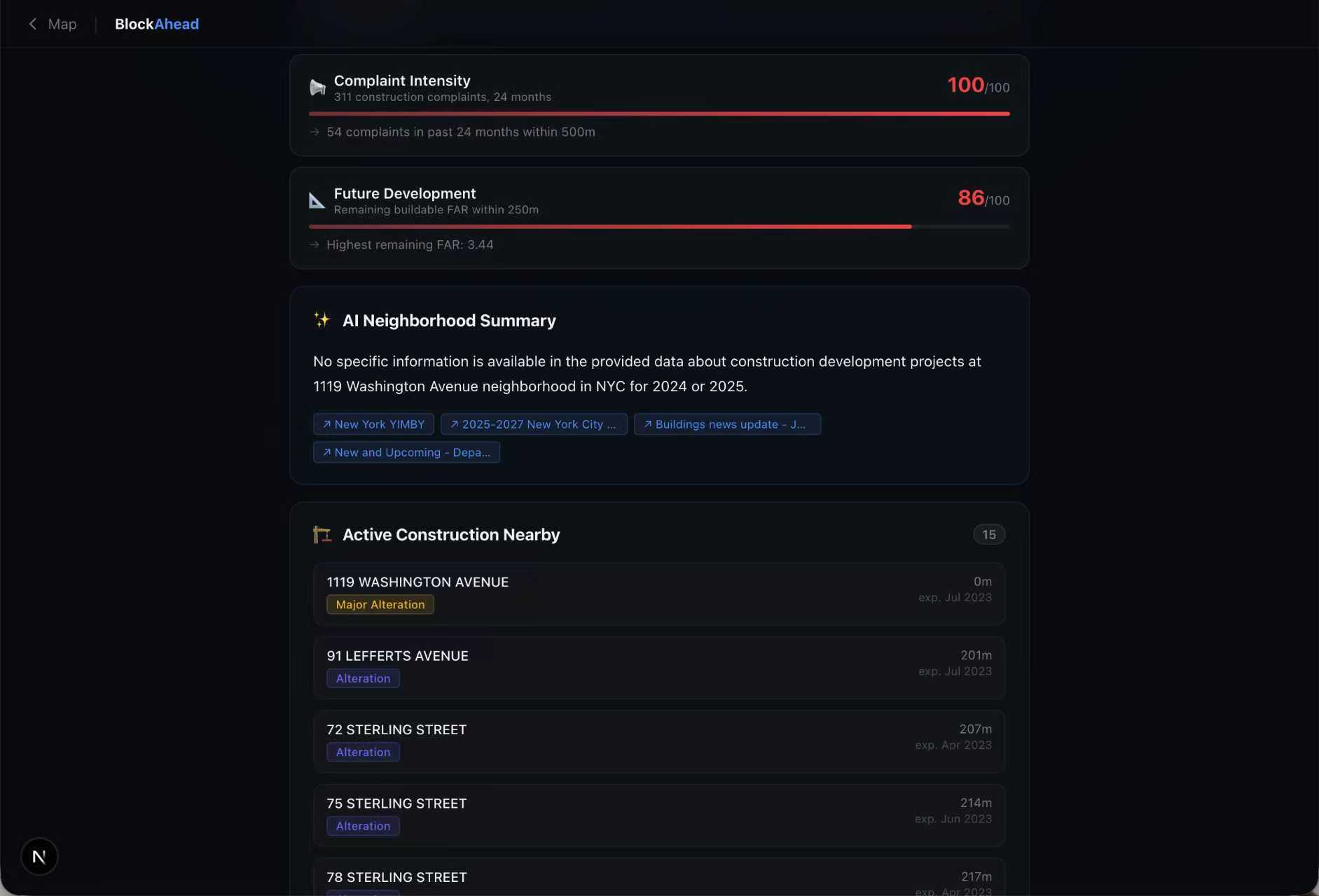 Over 750,000 noise complaints hit NYC's 311 system every year. Construction is the #1 source. You sign a lease, move in, and discover a tower going up next door with weekend demolition permits. The city publishes all this data — permits, after-hours variances, complaints, zoning — but it's scattered across six different portals. Nobody checks before signing. We built BlockAhead so apartment hunters can see what's coming before they commit.