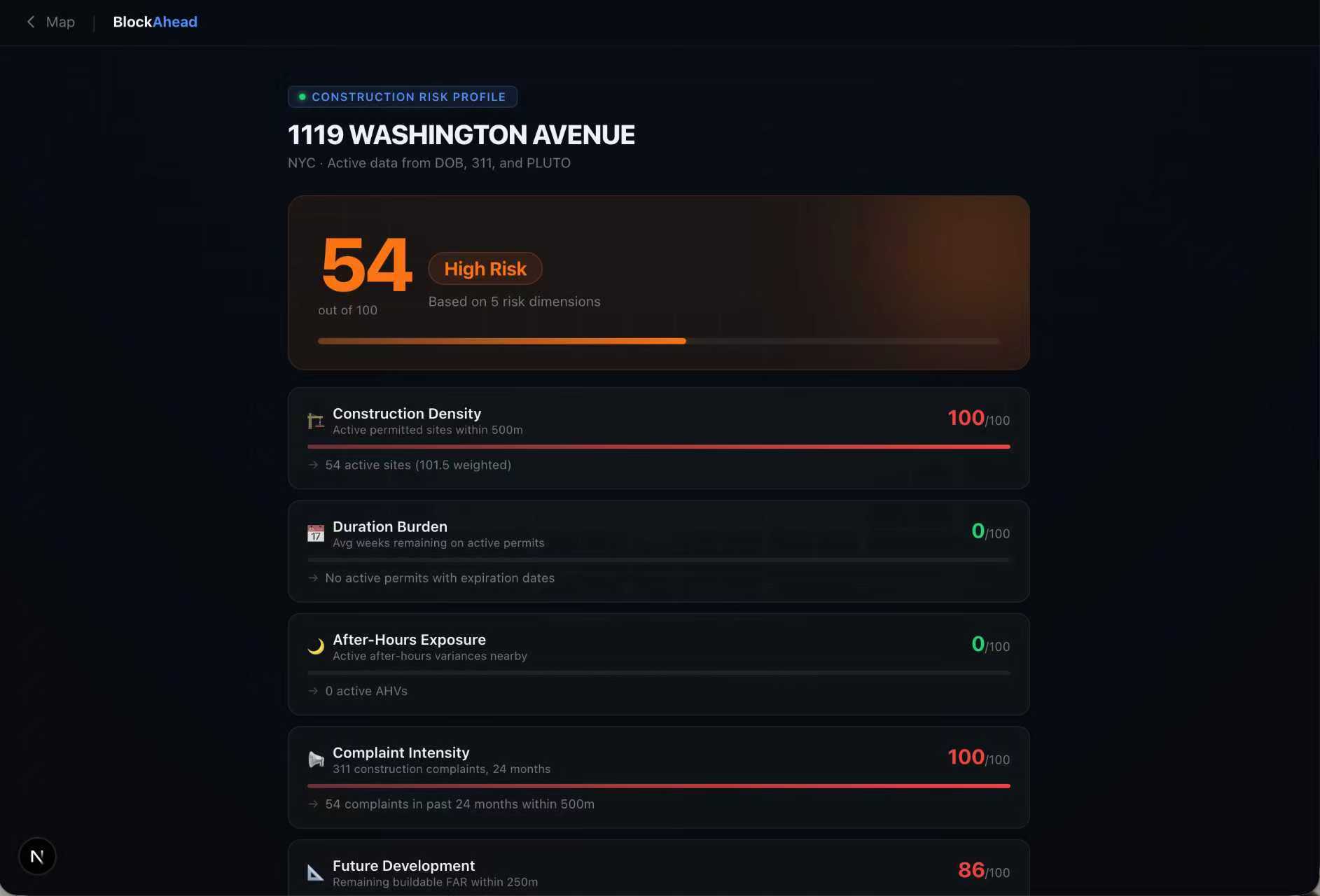 BlockAhead gives any NYC address a 0–100 construction risk score. The score spans five dimensions: construction density, project duration, after-hours noise, complaint history, and future development potential. An interactive 3D hex grid map covers all five boroughs. Color and height encode severity at a glance. Zoom in to see individual permits, AHV flags, and complaint hotspots. A development overlay reveals underdeveloped lots where construction hasn't started but likely will. Each address profile includes an AI-generated neighborhood briefing with recent news and live data context.
