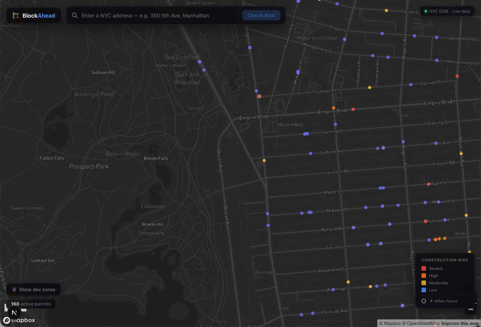 Real risk data across all five boroughs. Not mock data. Not one neighborhood. The entire city, backed by 1.2 million live records. The hex grid makes density legible at any zoom. 3D extrusions give a visceral sense of severity. The risk score isn't a black box — every dimension shows its evidence. The development overlay answers a question no existing tool does: where will construction happen next?