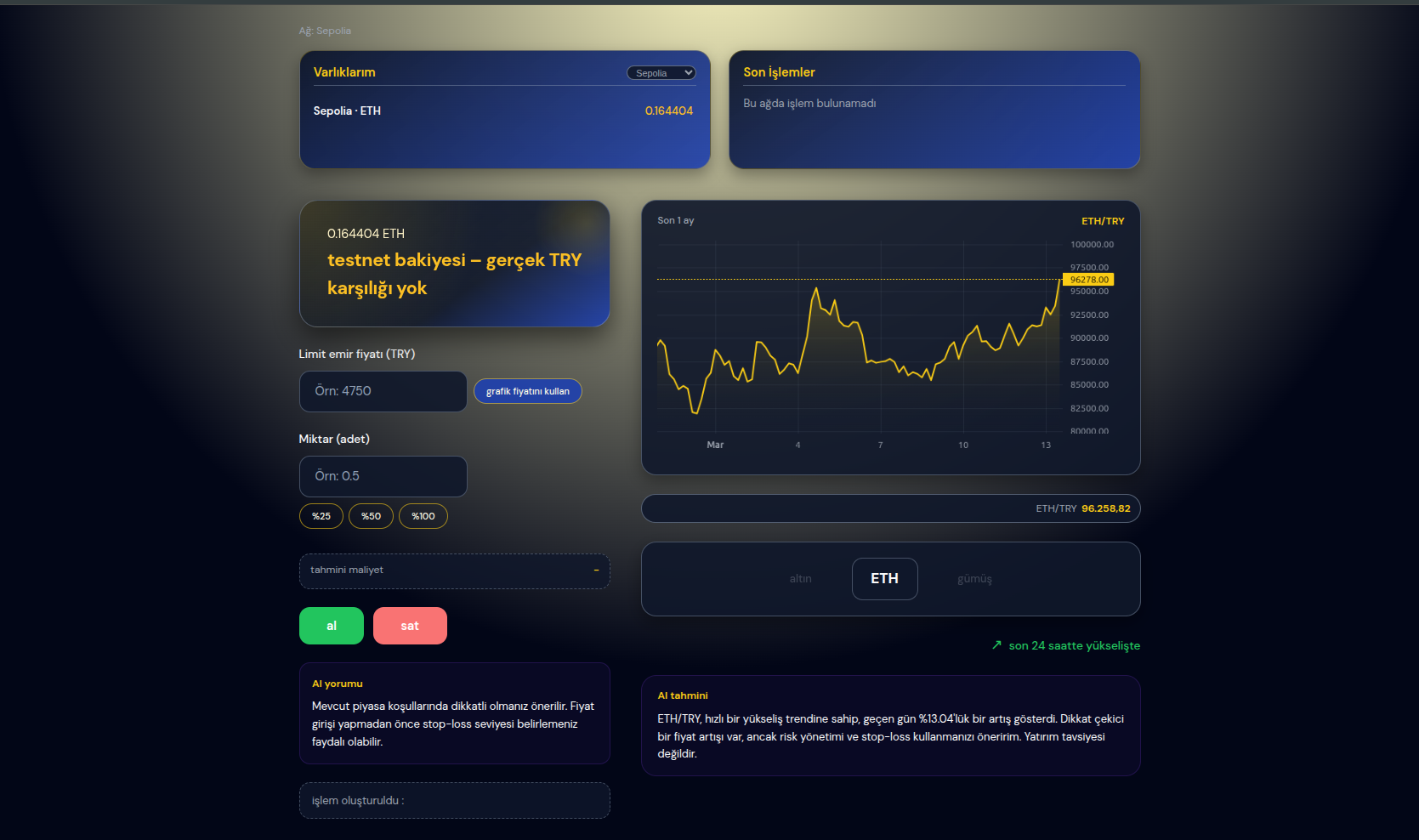 We built the frontend with HTML, CSS, and vanilla JavaScript for a lightweight and accessible experience. Using ethers.js, the app connects to EVM-compatible wallets to read balances and recent on-chain transactions. A small Node.js and Express backend acts as a proxy to an LLM API. It sends order and wallet context to the model and returns short, focused risk explanations to the UI. Lightweight Charts is used for the price chart, keeping the interface simple but informative for users learning about markets.